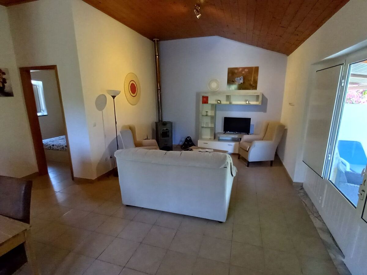Casa Borboleta T2, a semi-detached villa, features a cozy living room, two bedrooms—one with a king-size bed and the other with two single beds—a fully equipped kitchen with a gas stove, coffee machine, and refrigerator, and a bathroom complete with a shower, toilet and washbasin.