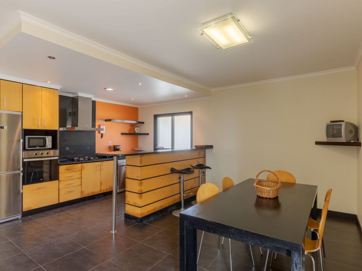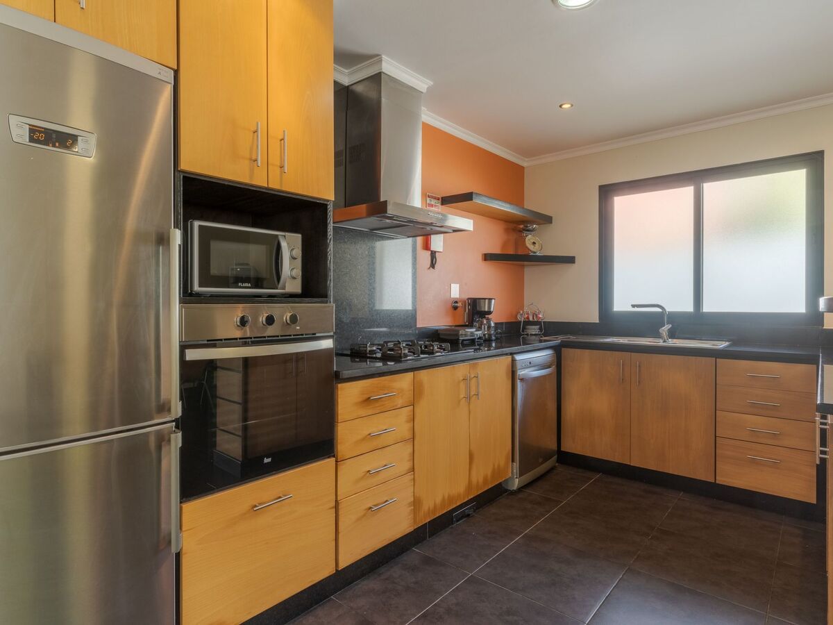 The kitchen is fully equipped with an oven, microwave, coffee machine and dining area.