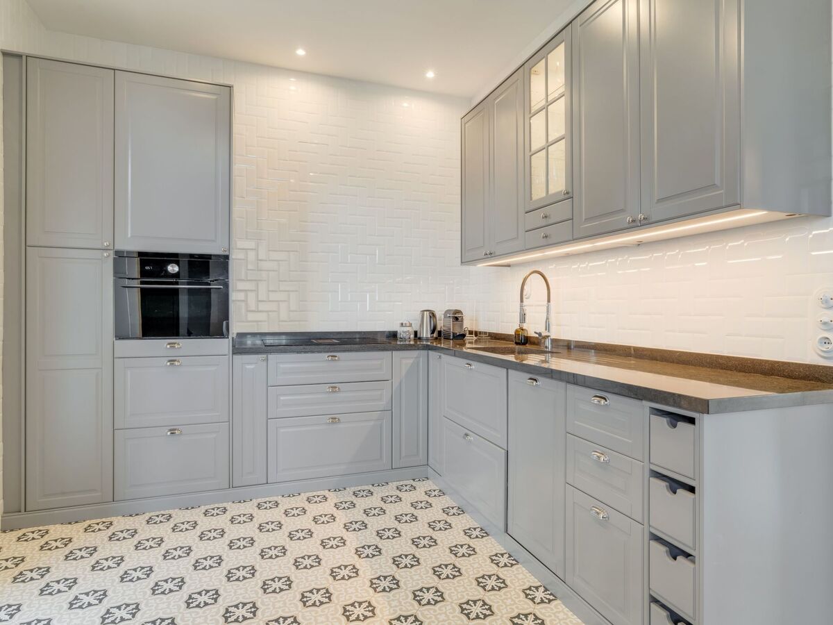 The kitchen, equipped with modern appliances, maintains a rustic feel with wooden cabinets and colorful tiles