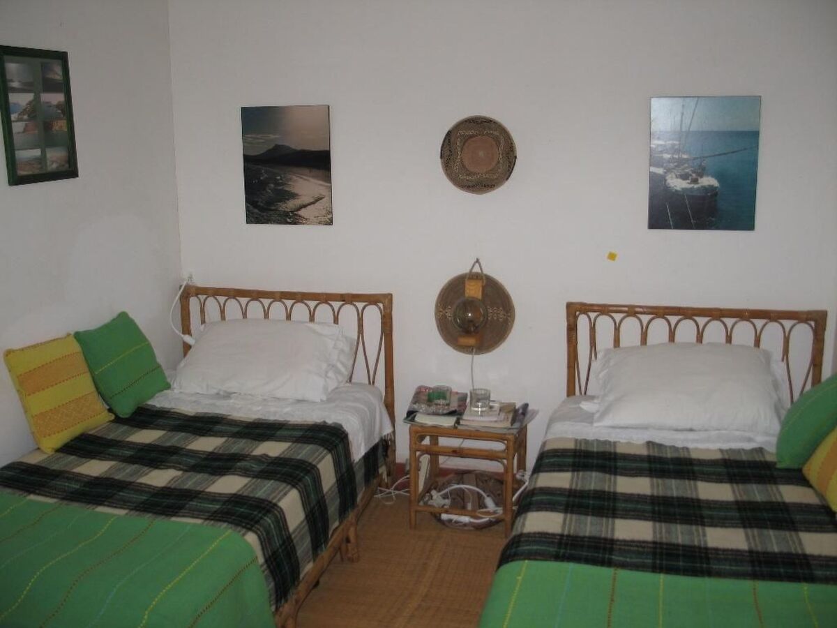 The bamboo bedroom has two single beds and next to it there is the red bedroom with two single beds and a bunk bed for two children.