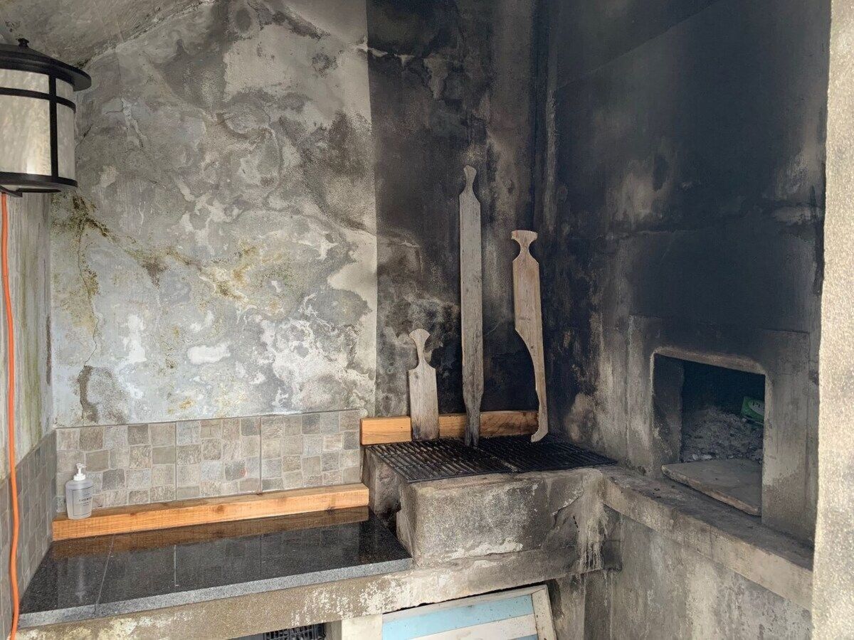 À l'arrière de la maison il y a un patio avec tables, chaises et barbecue avec une vue intérieure imprenable et saine.