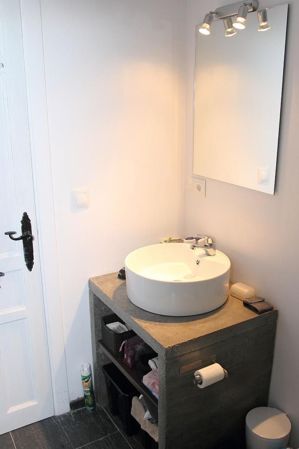 The modern bathroom has a walk-in shower with rain shower, a washbasin with cabinet and mirror, a toilet and a window.