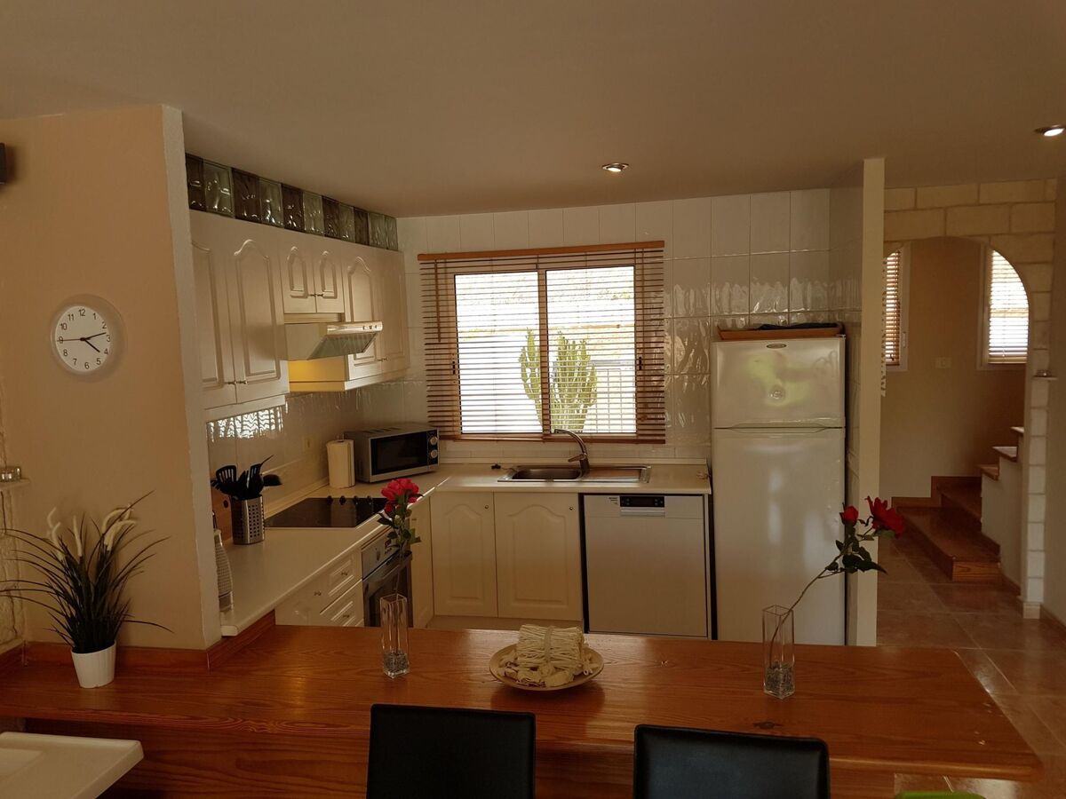 La cuisine est entièrement équipée d'un lave-vaisselle, cuisinière avec plaque vitrocéramique, four, micro-ondes, cafetière, grille-pain, bouilloire et un réfrigérateur-congélateur.