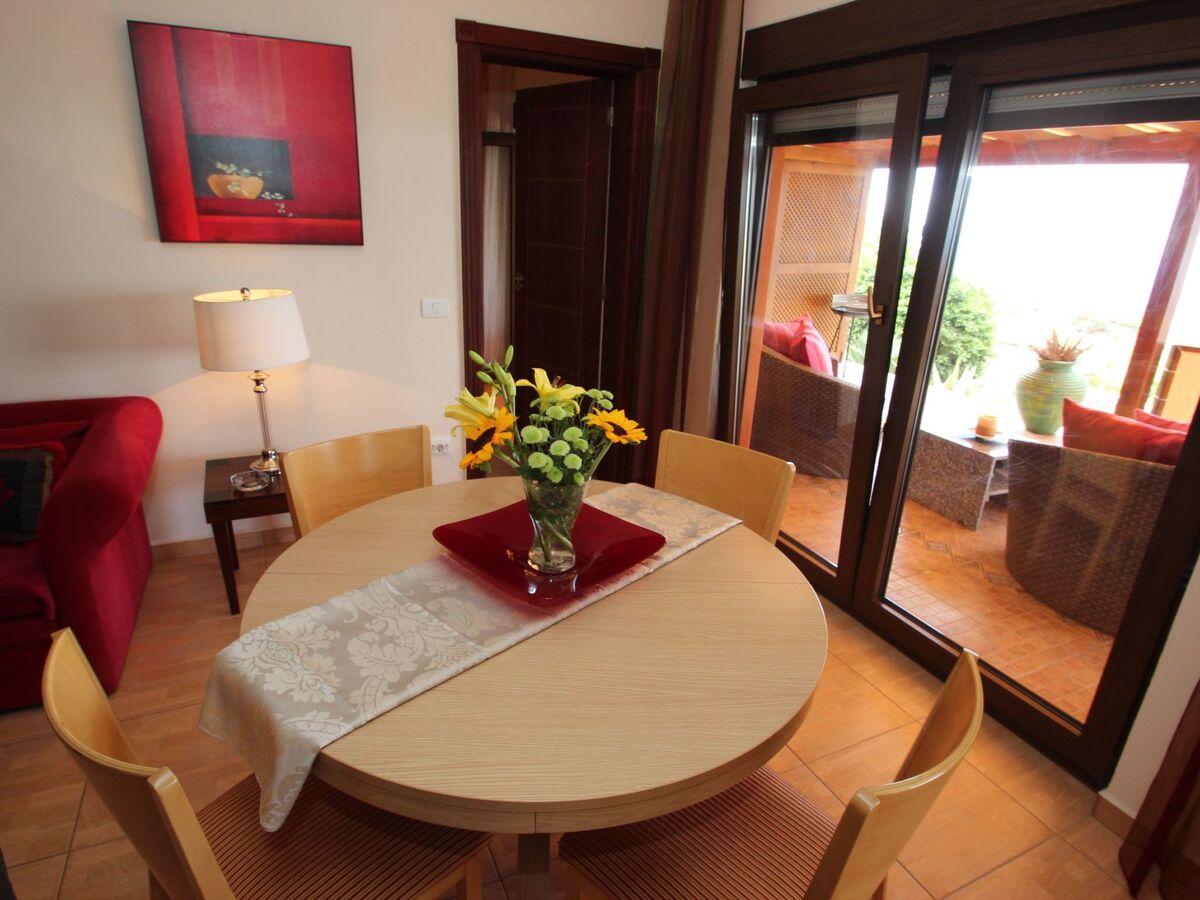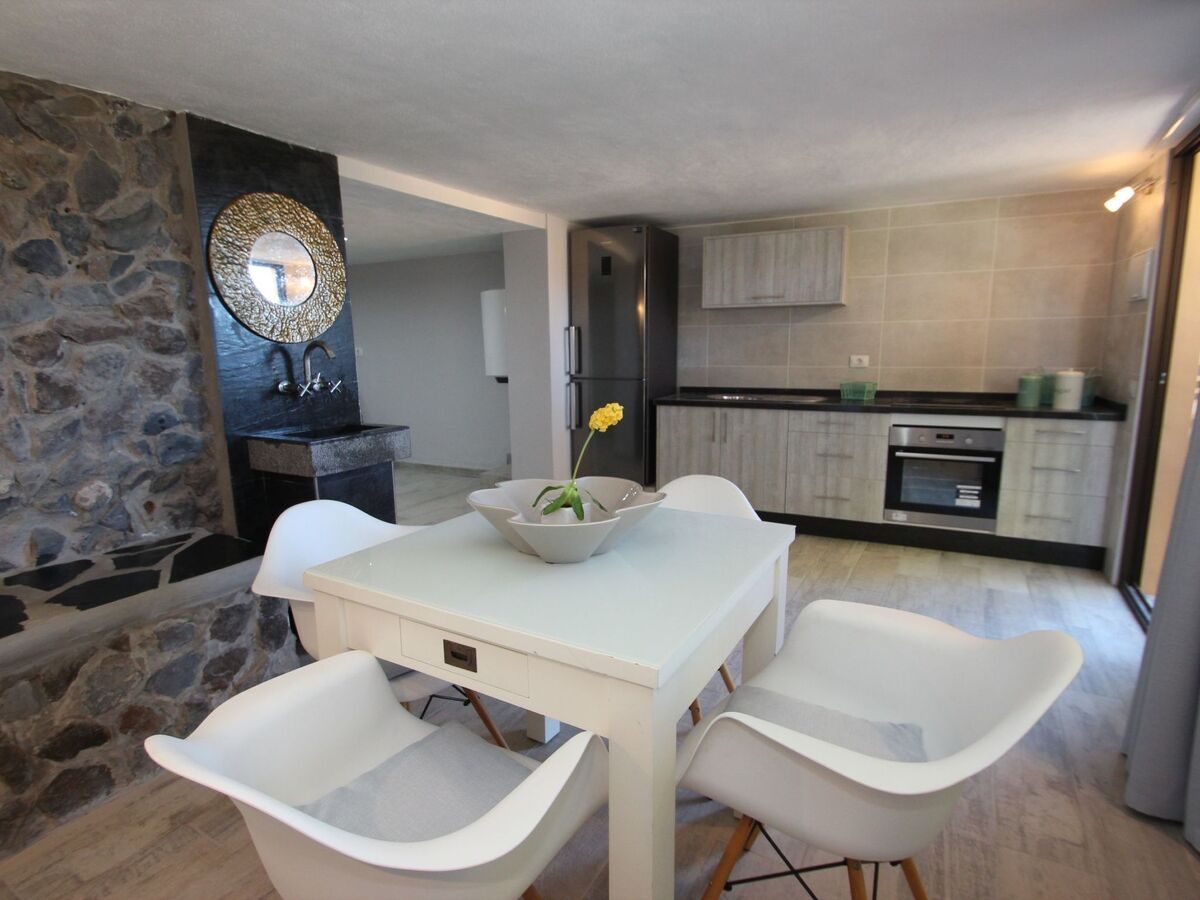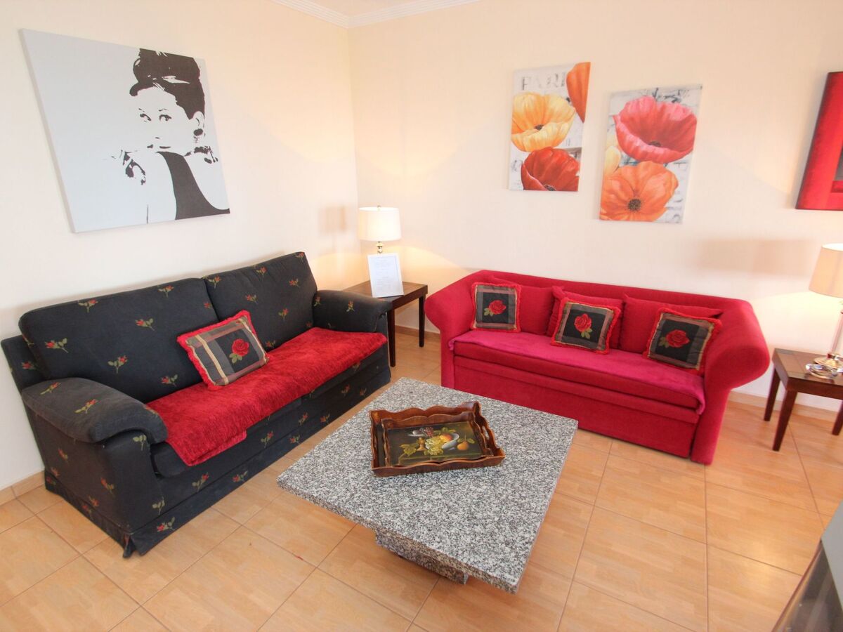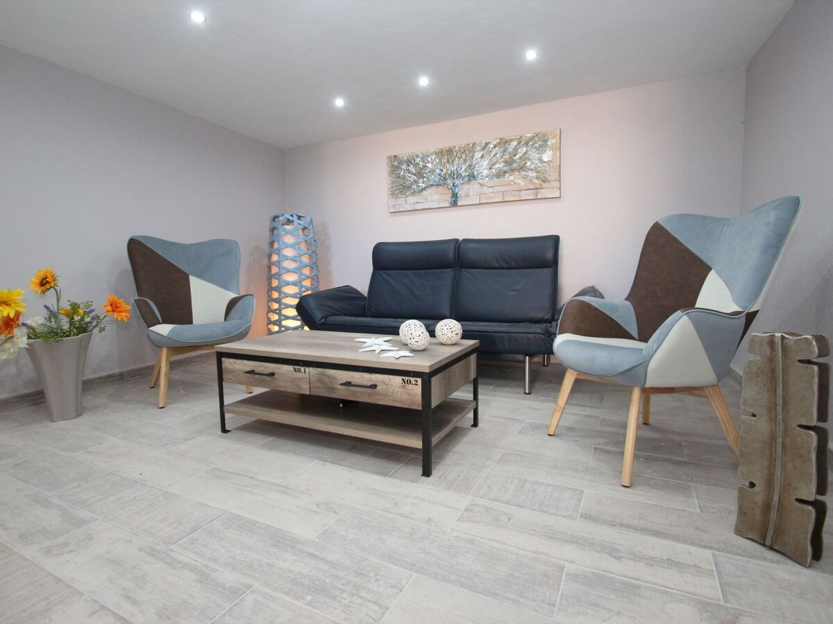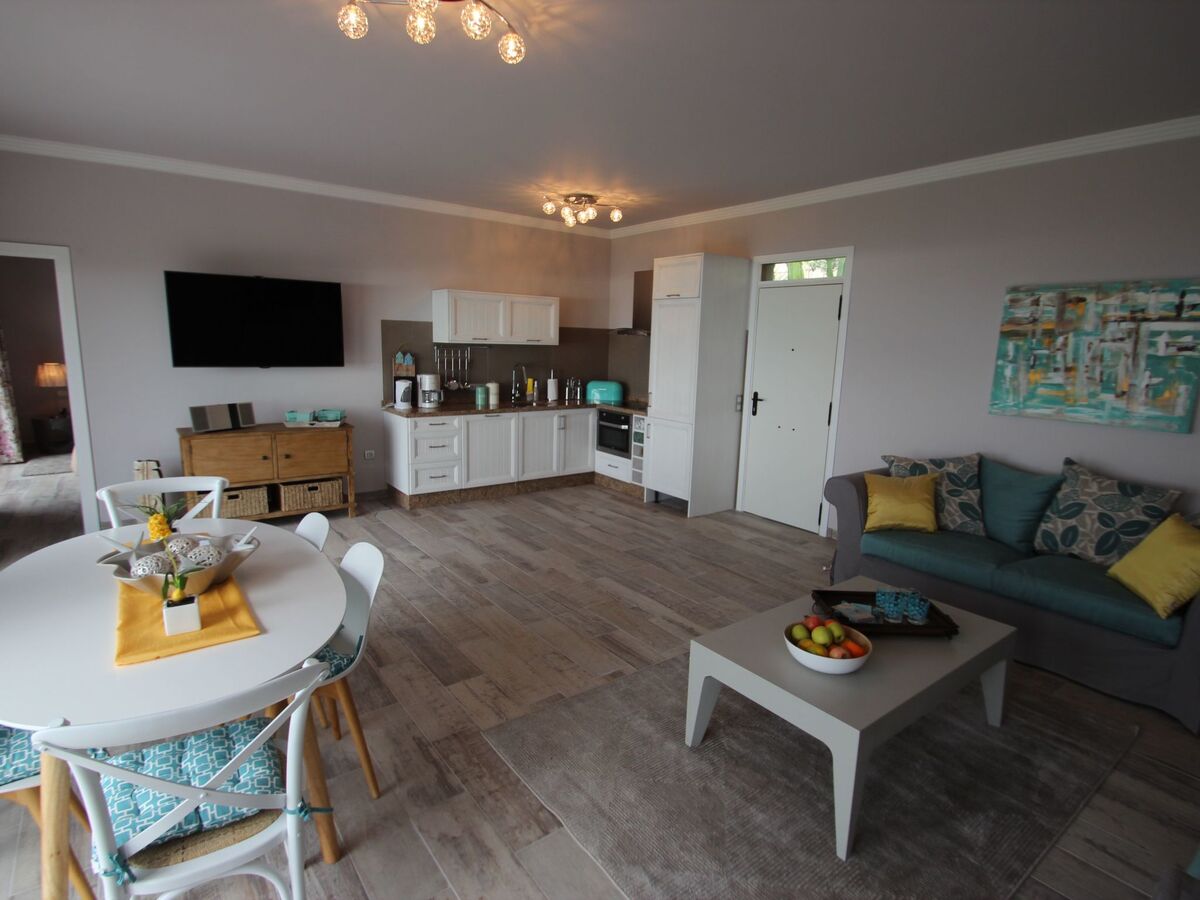 The large living(dining room is furnished with an electric fireplace and a sofa bed (135 x 190 cm).