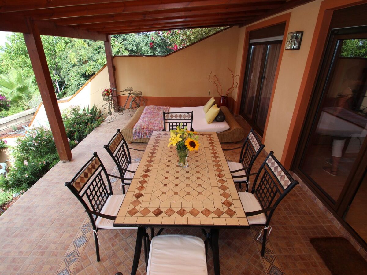 A very spacious patio with a pergola and a barbecue, a table with six chairs, sitting accommodation and two sun loungers spreads the length of the living room.