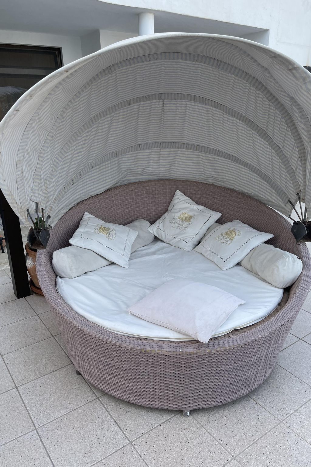 The upper viewing and sun terrace (140 m²) is furnished with a rattan daybed, sun loungers and a table with armchairs.