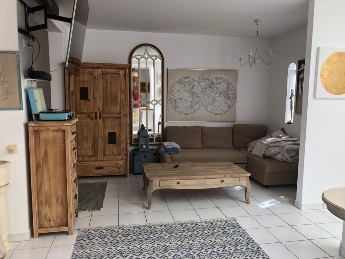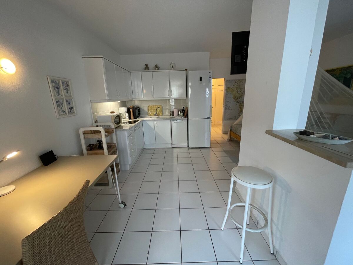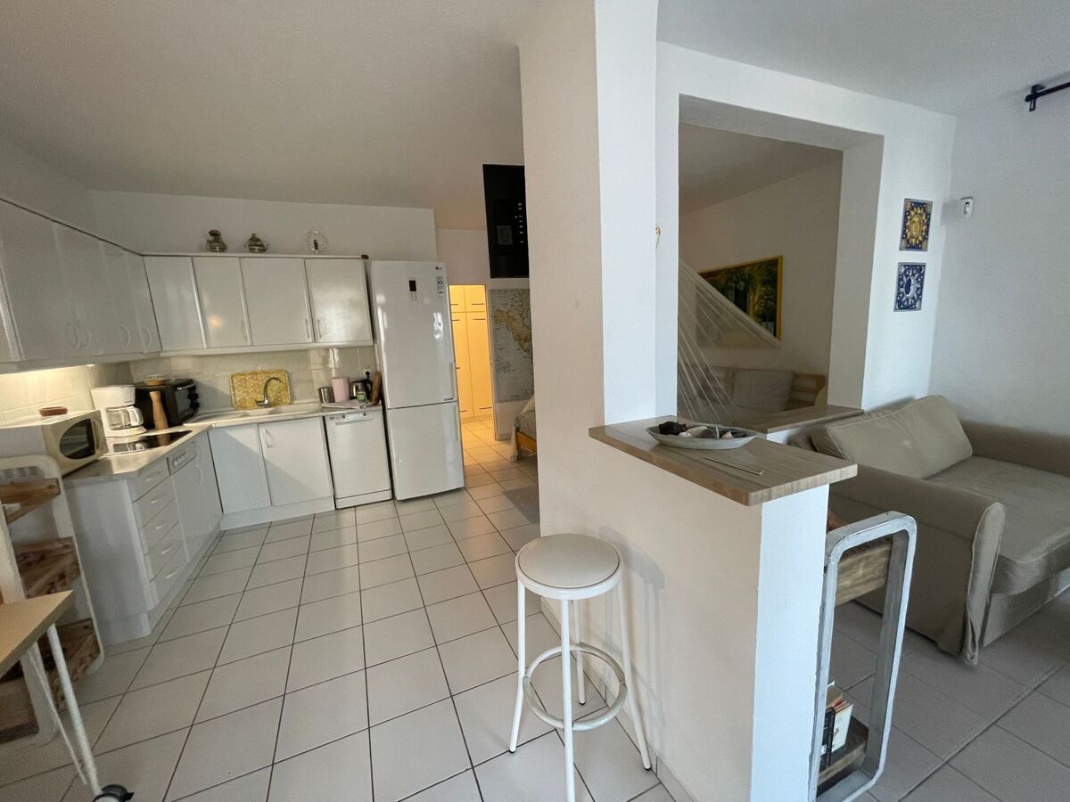 The living room is connected to an open-plan, fully equipped kitchen with bar.