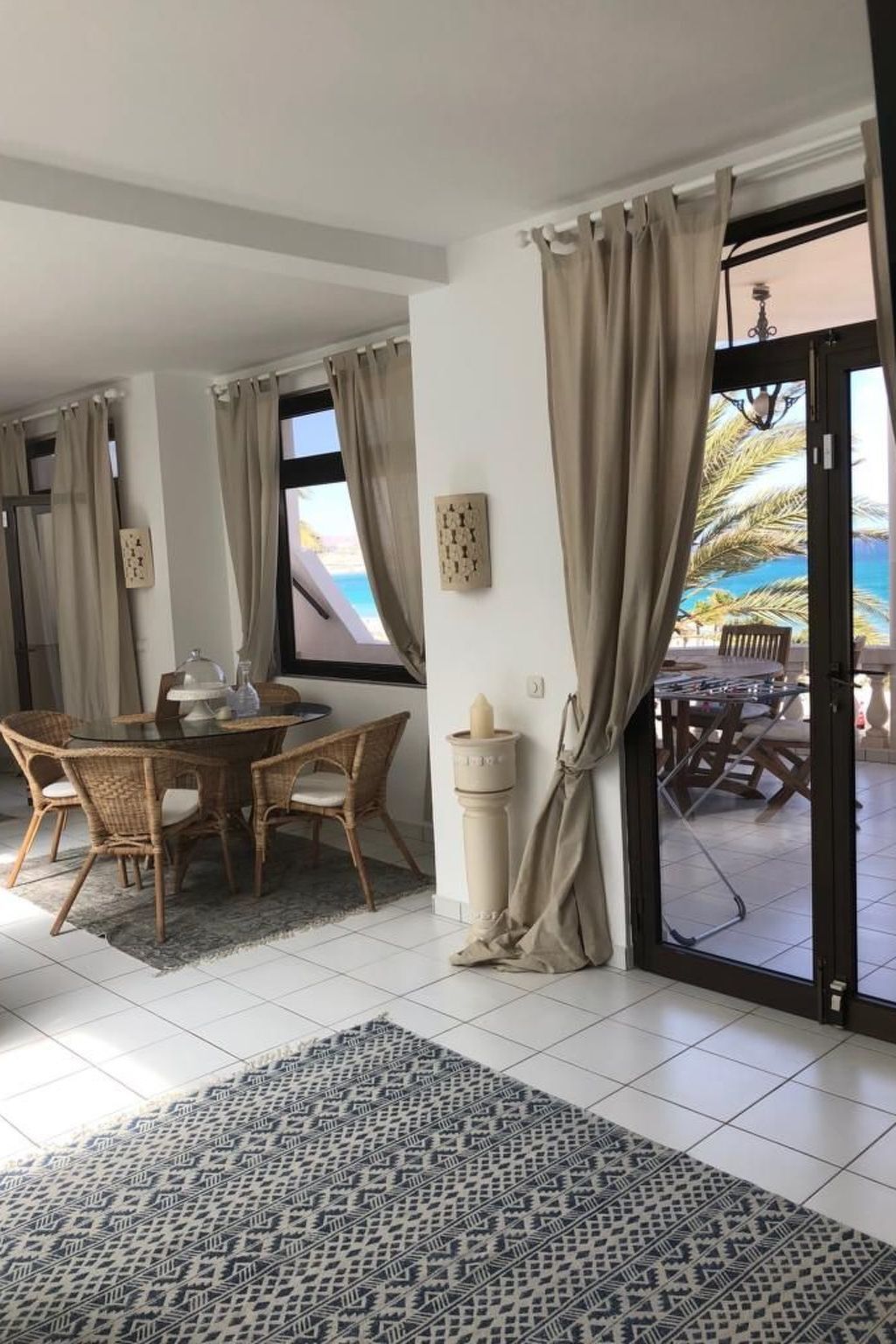 Living room with white furniture, a wicker dining room with beautiful sea views, a comfortable sofa, satellite TV, DVD player and music system are just some of the advantages of this unique property.