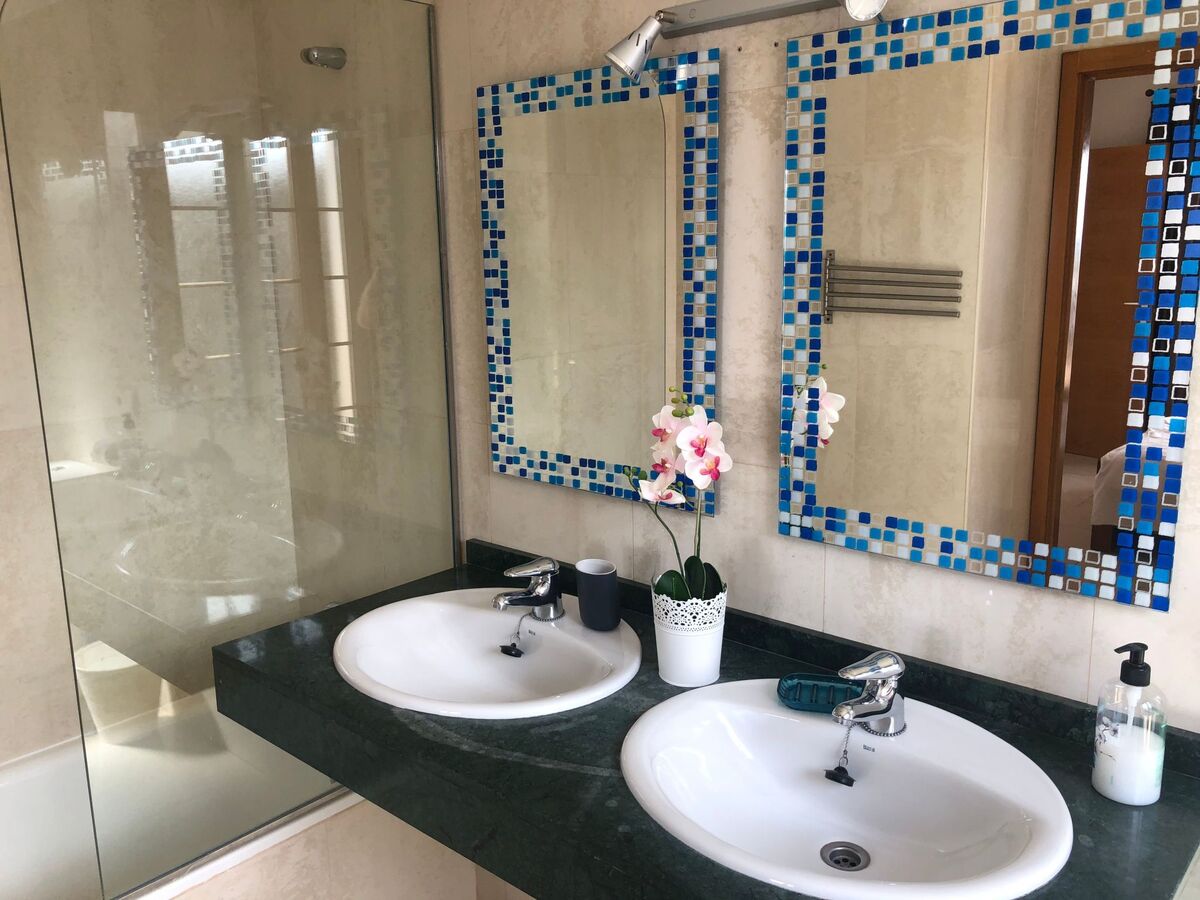 The bedrooms on the upper floor each have an en-suite bathroom, while the two bedrooms on the lower floor share a spacious bathroom with both bath and shower.