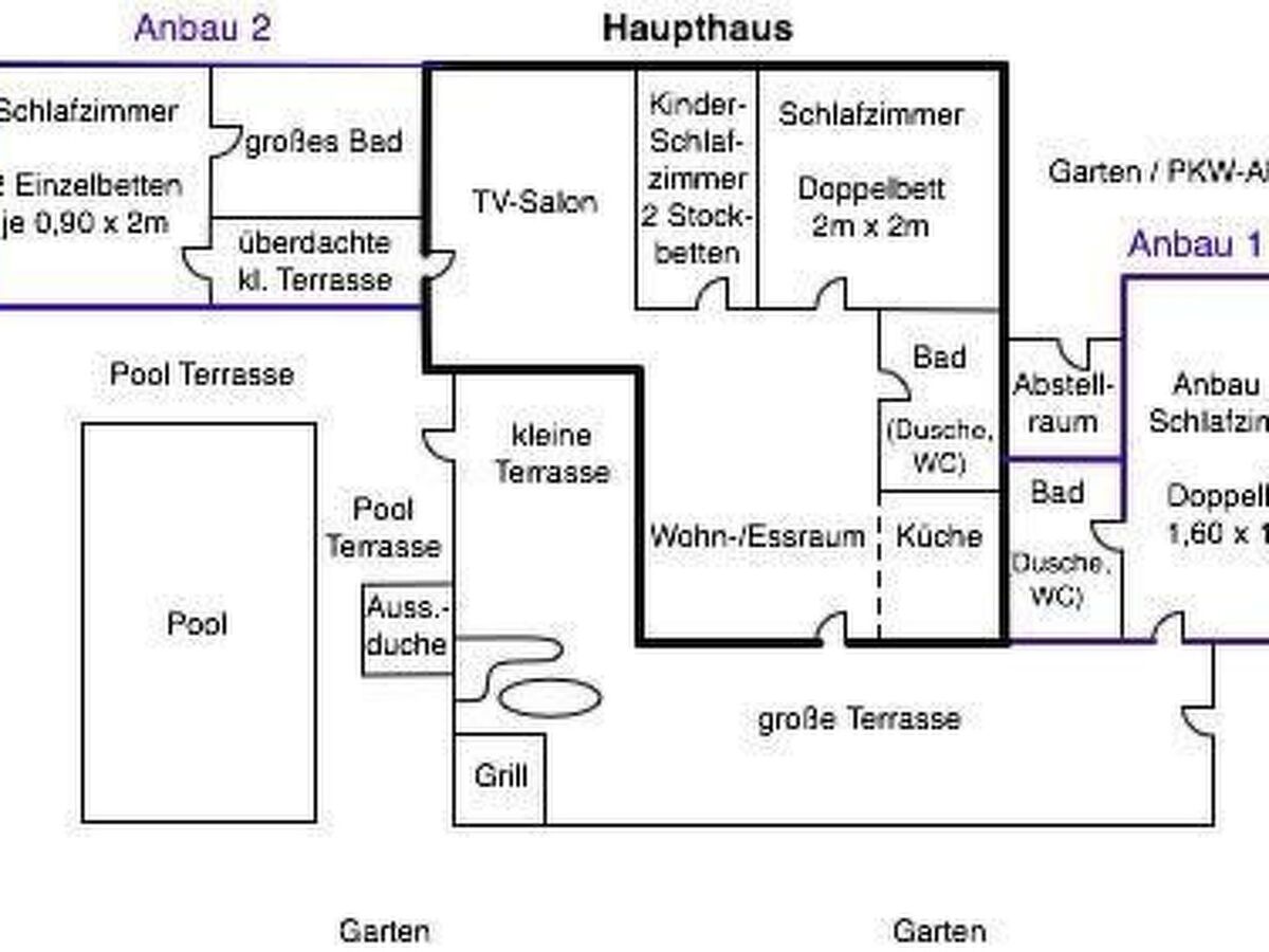 A large outside area with a solar-heated pool, many lying surfaces and various terraces invites you to spend some time relaxing.