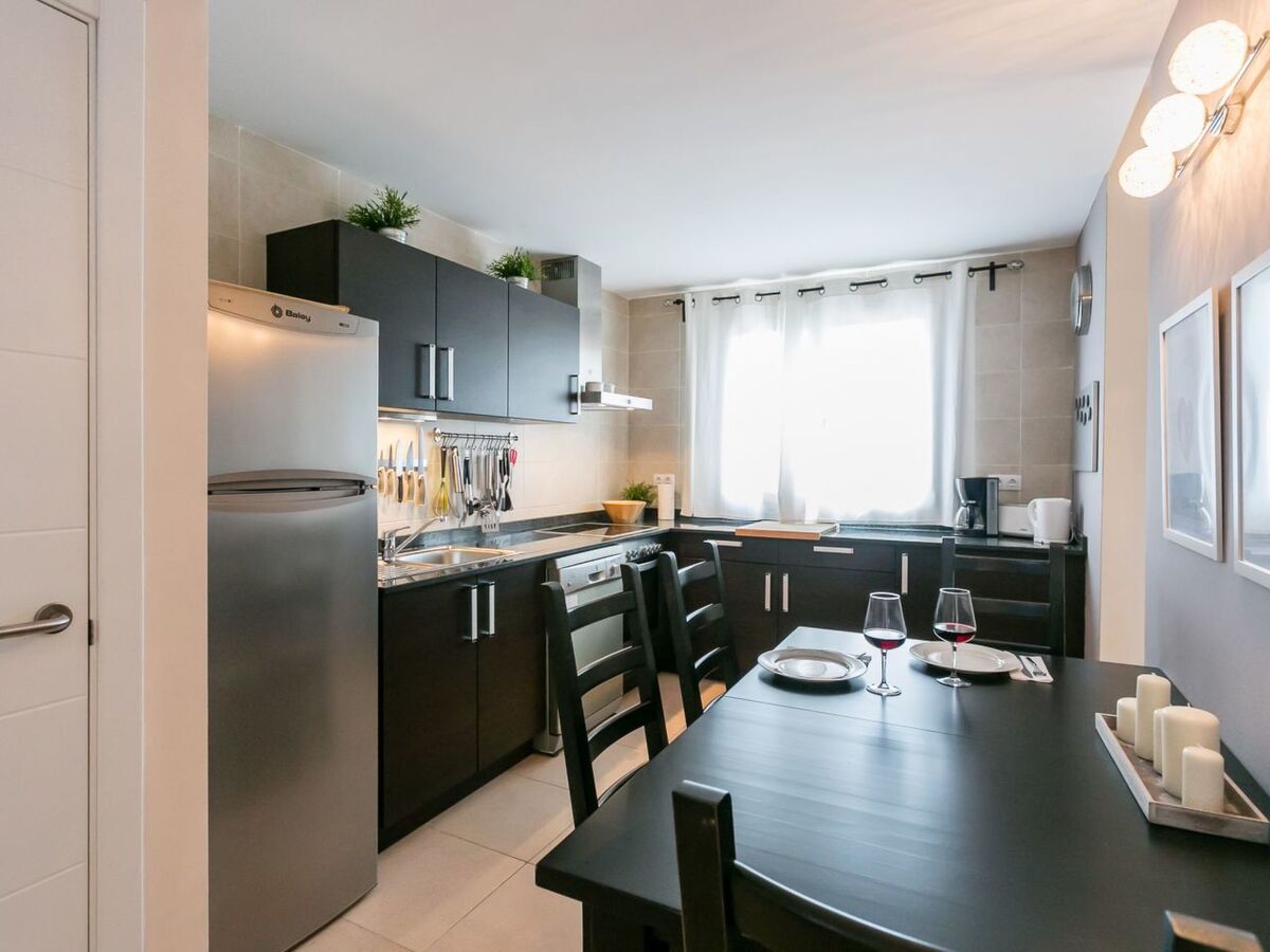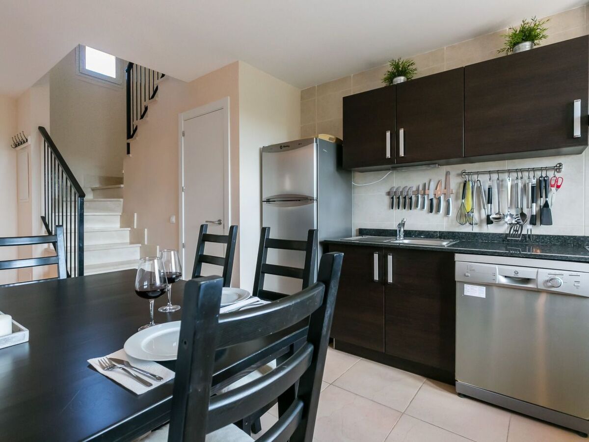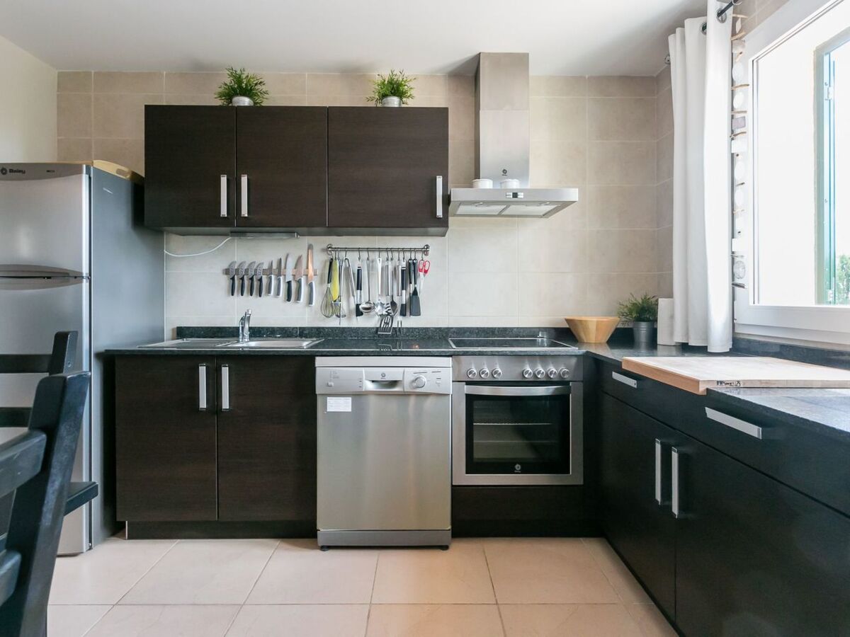 La cuisine moderne est équipée avec lave-vaisselle, grand réfrigérateur avec congélateur séparé, four, plaques vitrocéramiques, cafetière, grille-pain, mixeur et machine à laver.