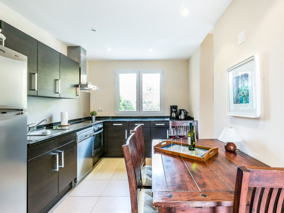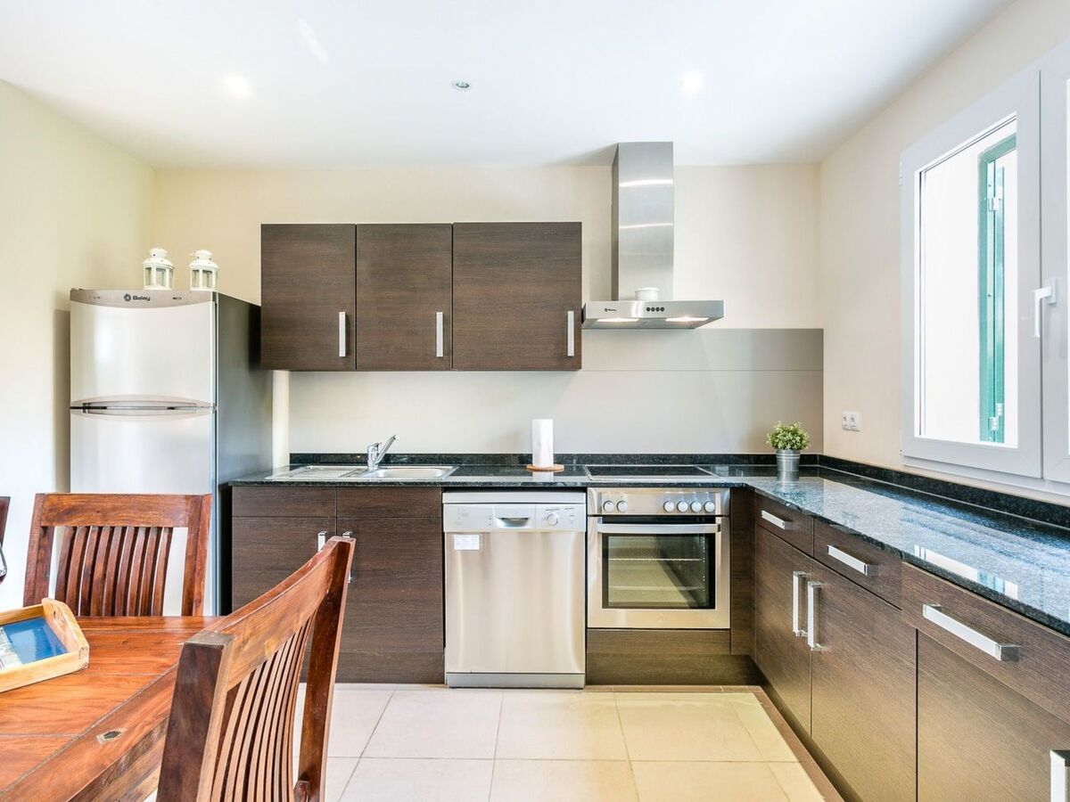 La cuisine moderne est équipée avec lave-vaisselle, grand réfrigérateur avec congélateur séparé, four, plaques vitrocéramiques, cafetière, grille-pain, mixeur et machine à laver.