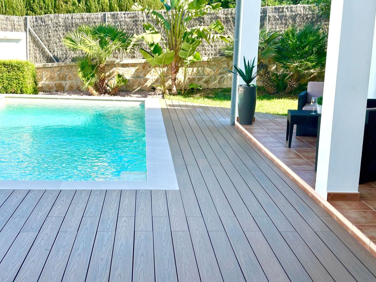 This newly built villa is equipped with three bedrooms and three bathrooms.