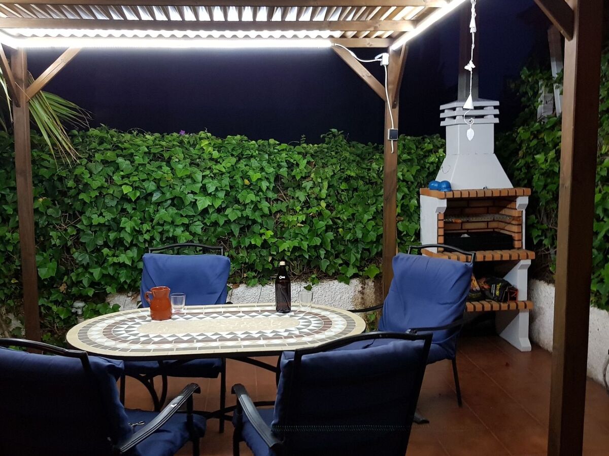 À l'extérieur de la villa, on trouve de nombreux coins salons, une terrasse équipée d'une table basse et de chaises, une pergola couverte où se trouvent une table, des chaises et un grand barbecue au charbon de bois.