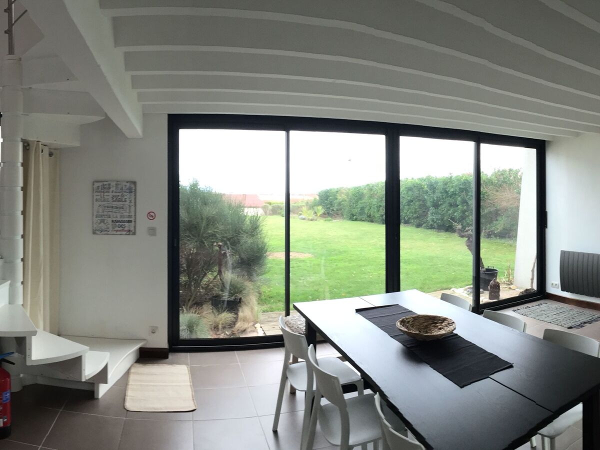 A dining room overlooking the sea with a large table 3m with 8 white chairs, two sofas with cushions, a radio, DVD player, bluetooth.
