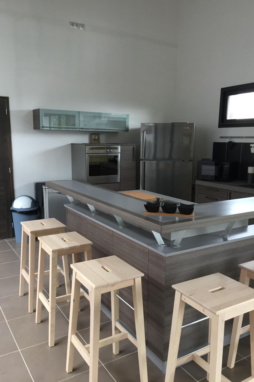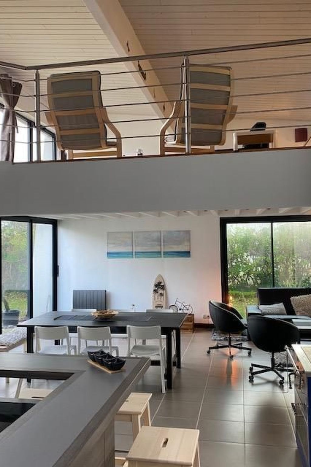 An equipped open kitchen with bar with 6 chairs, induction stove, hot air oven, microwave, dishwasher, washing machine, Senseo coffee machine, all necessary crockery.