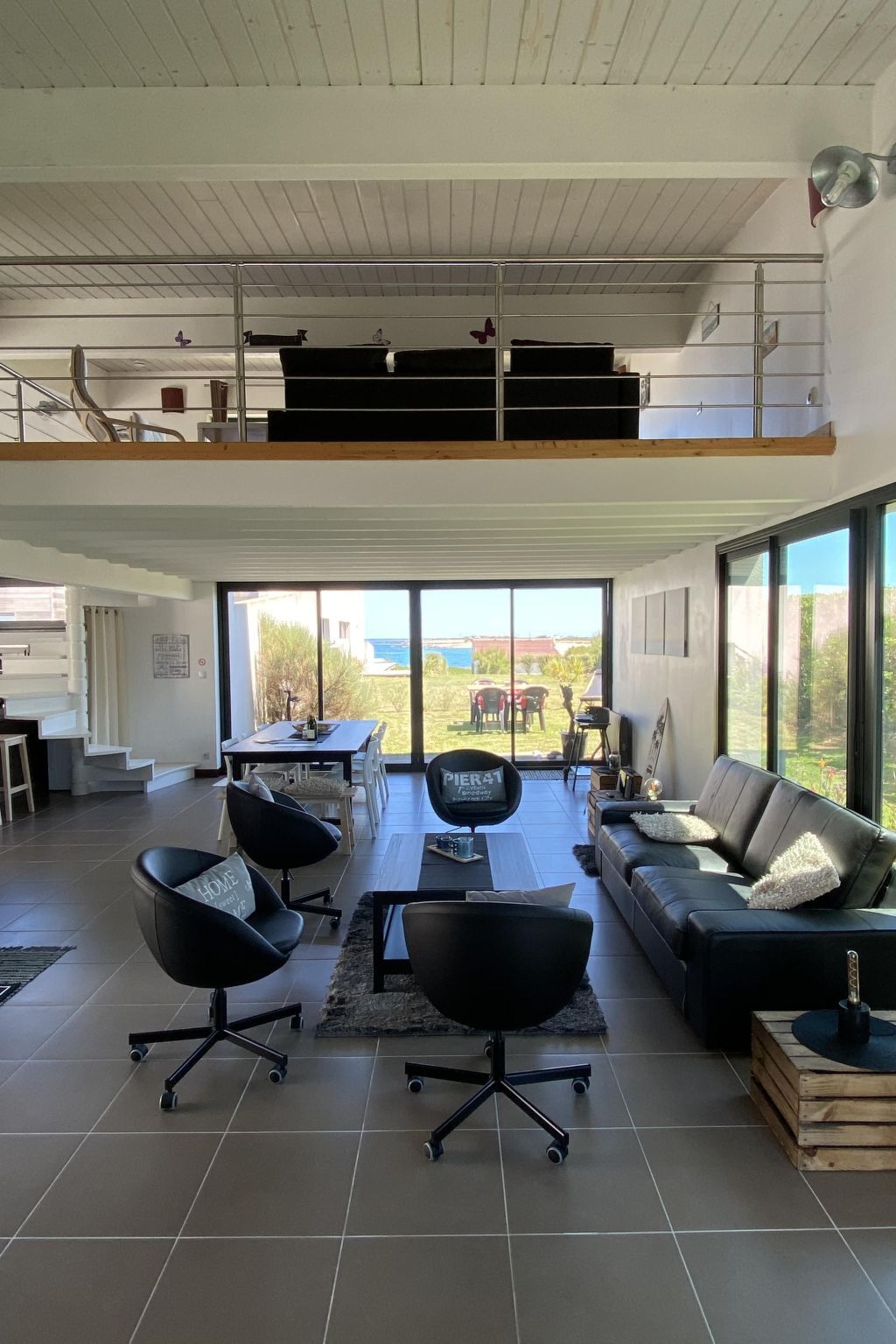 A large mezzanine with sea view with a large 55-inch smart TV, Orange TV decoder, two armchairs, a low table, a soft carpet, a sofa that converts into a double bed.