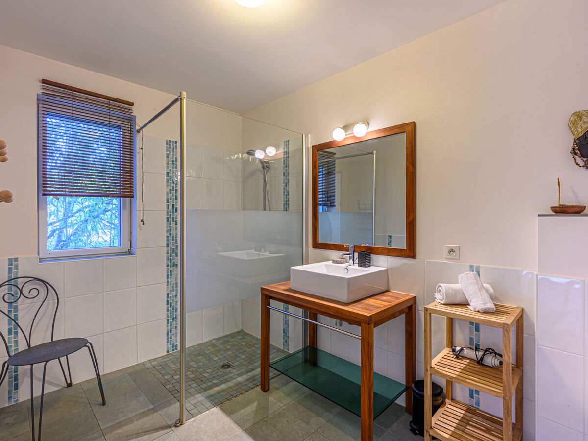 1 chambre avec 1 grand-lit (1 x 140 cm, longueur 190 cm), lavabo et douche/WC.