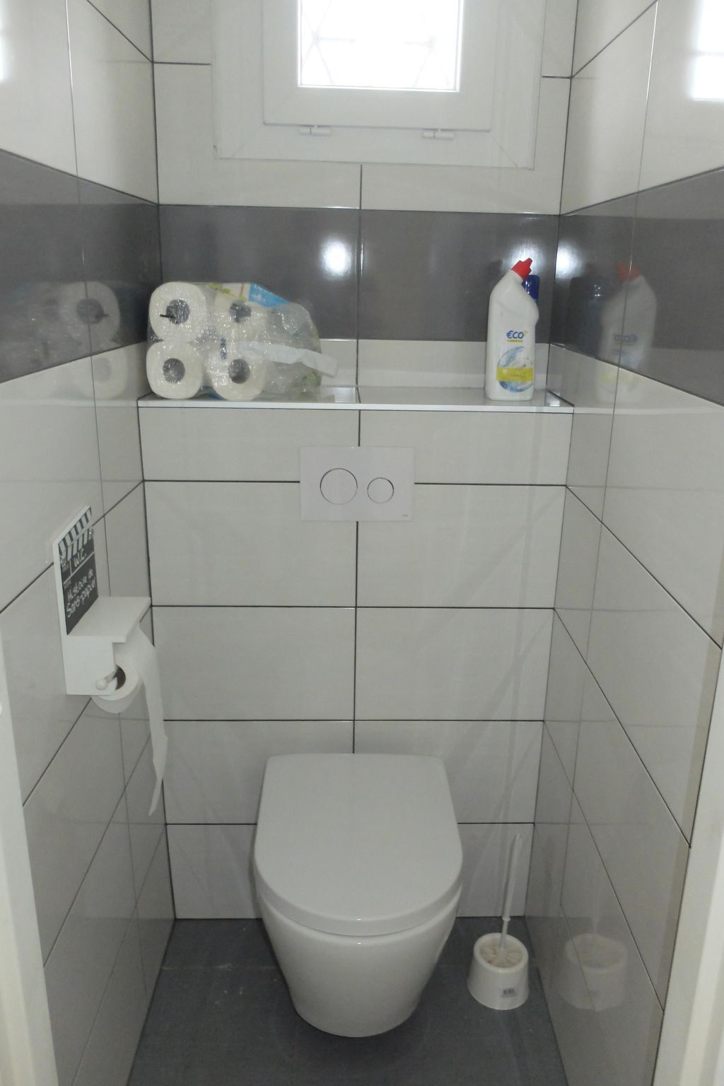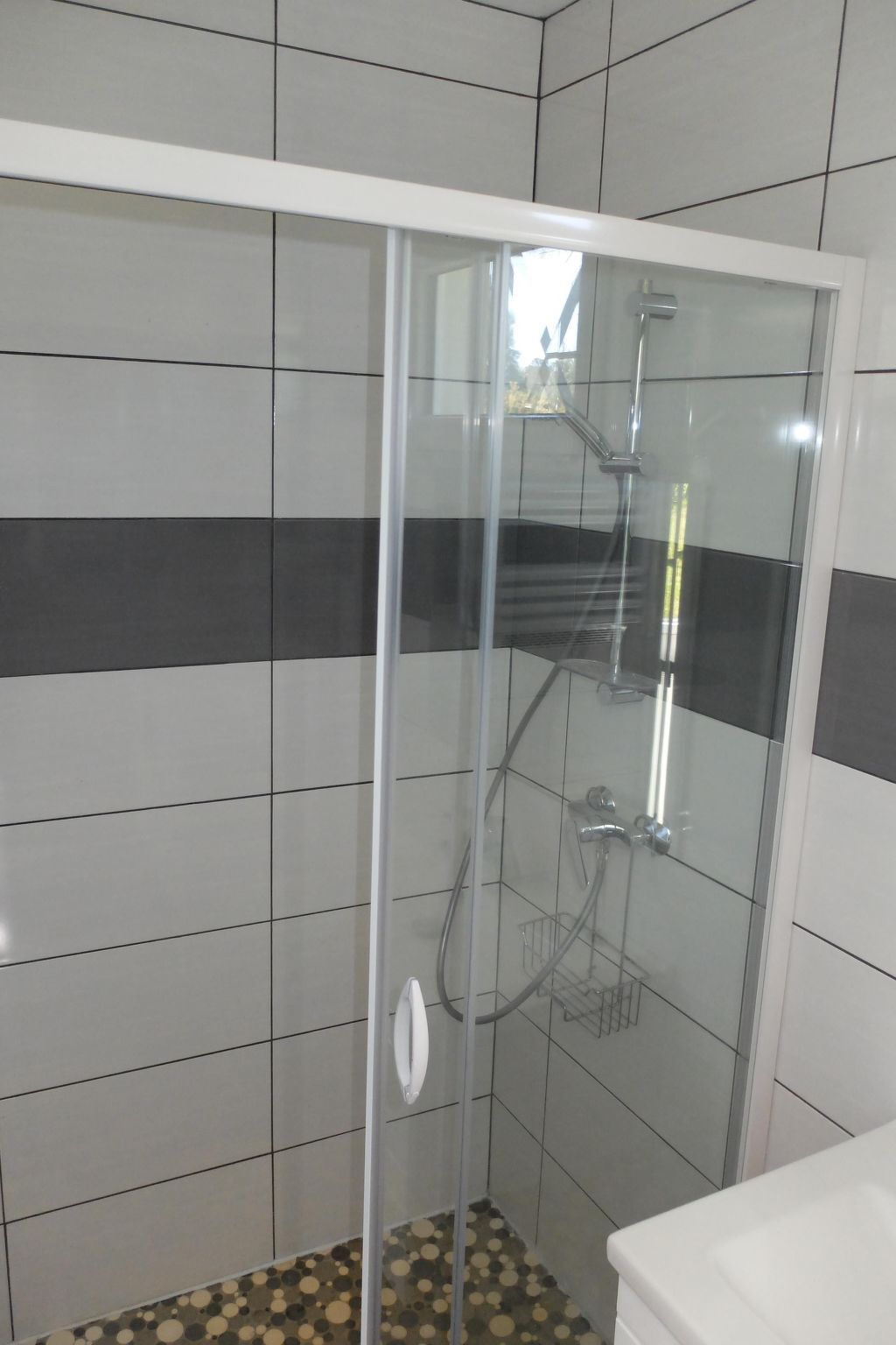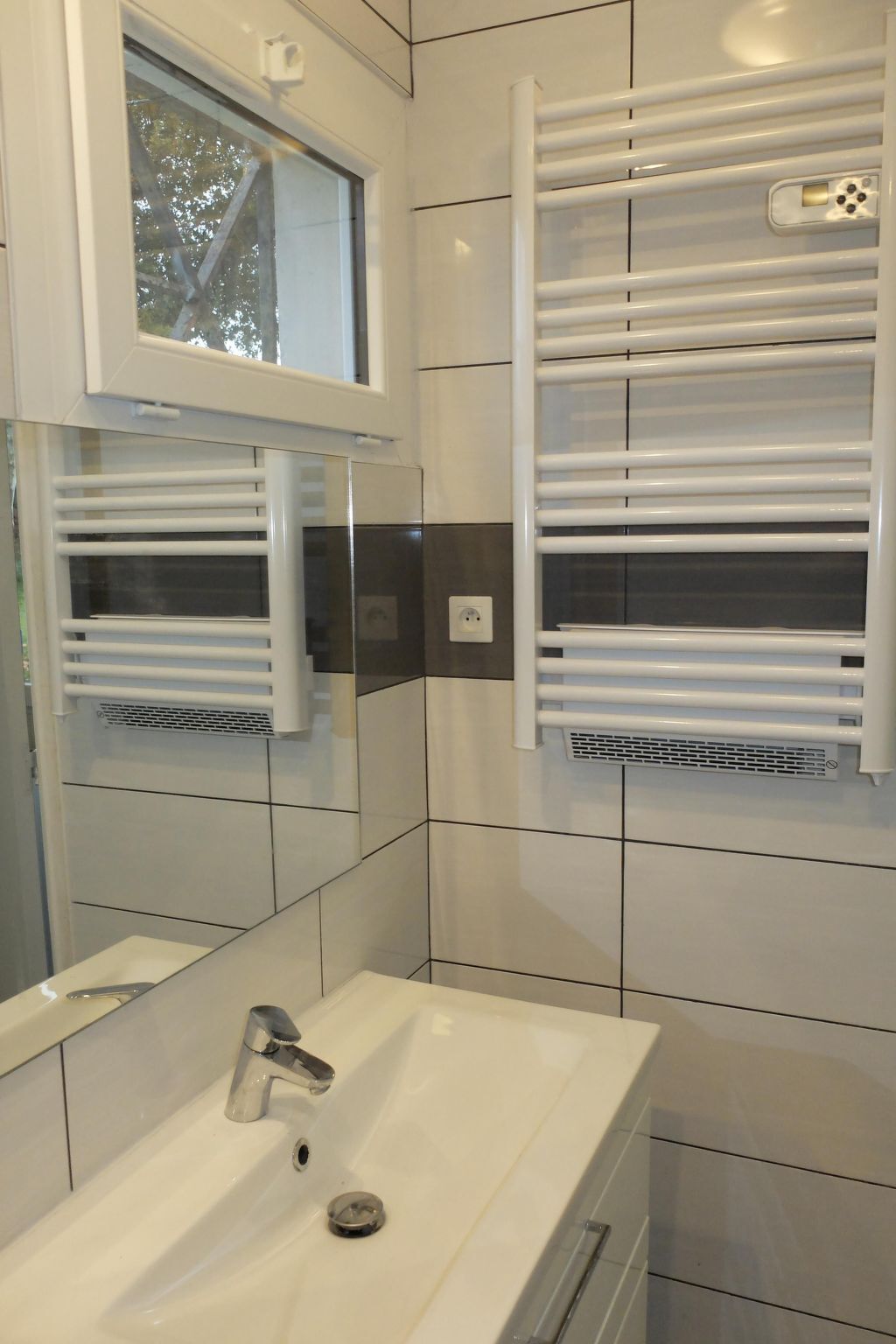 There is a modern bathroom with an Italian shower, large washbasin and a towel dryer with fan heater.