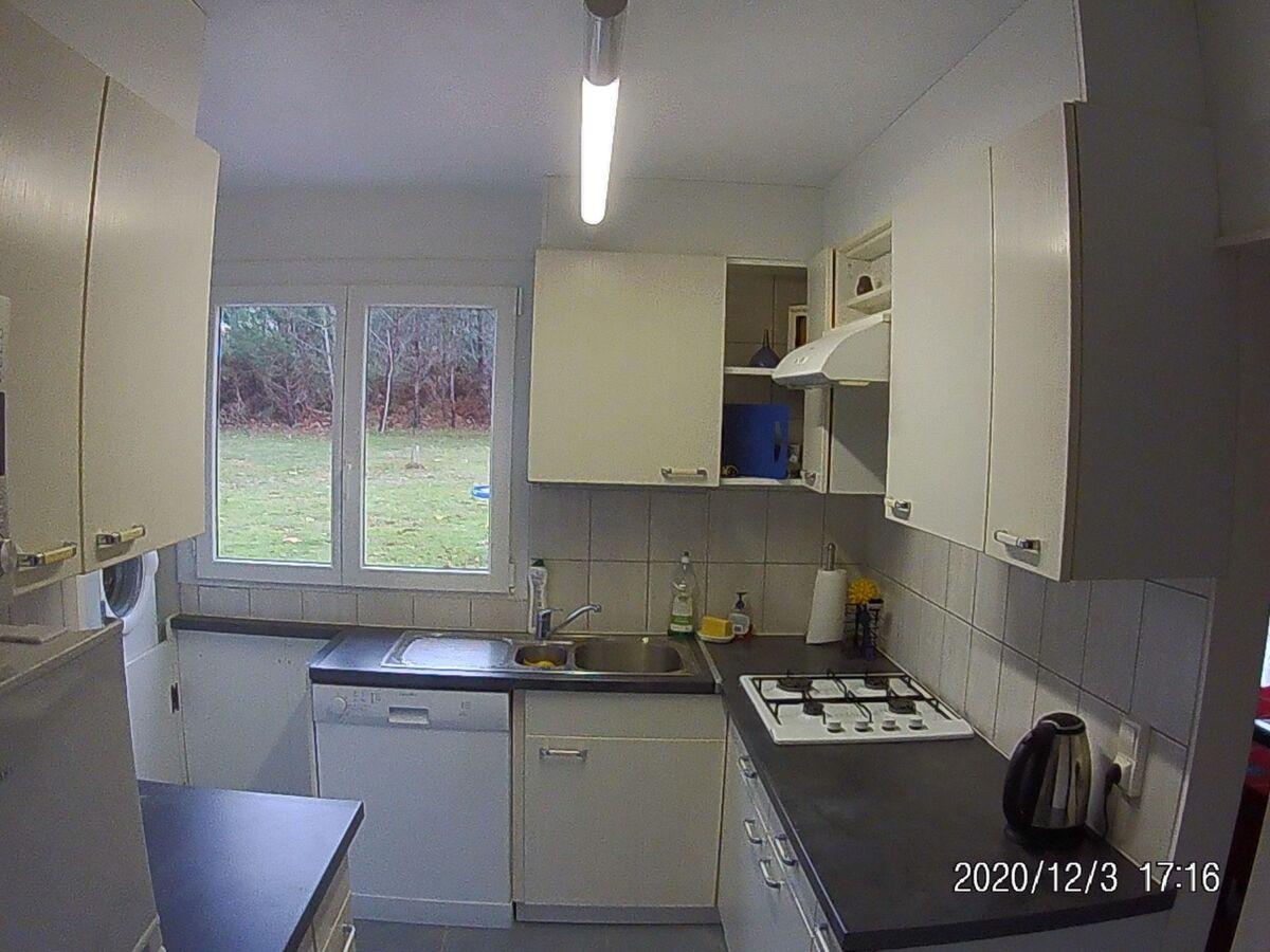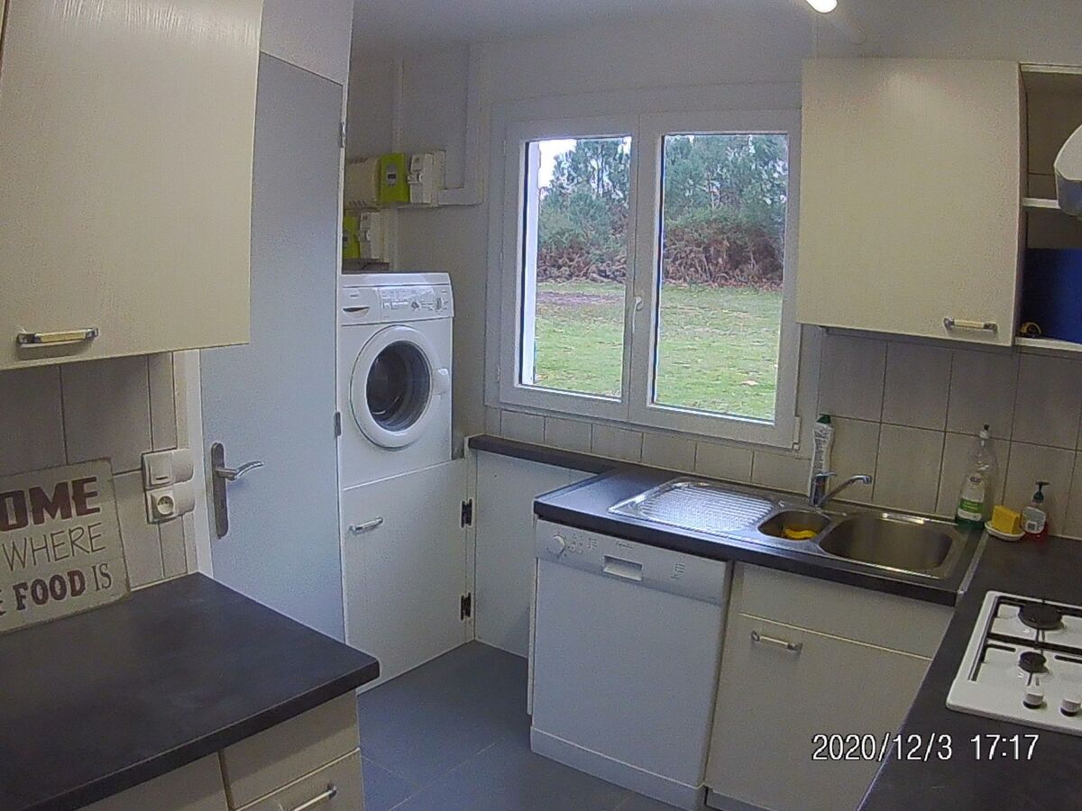 The kitchen is equipped with a fridge plus freezer compartment, a four-burner gas hob, a dishwasher, a washing machine, a coffee machine, a small oven/microwave and a kettle.