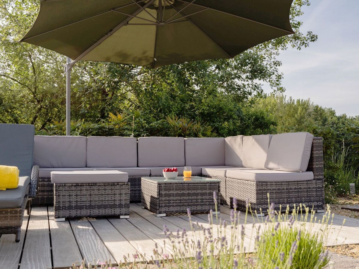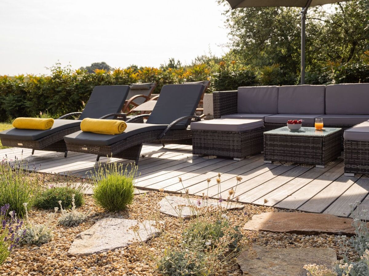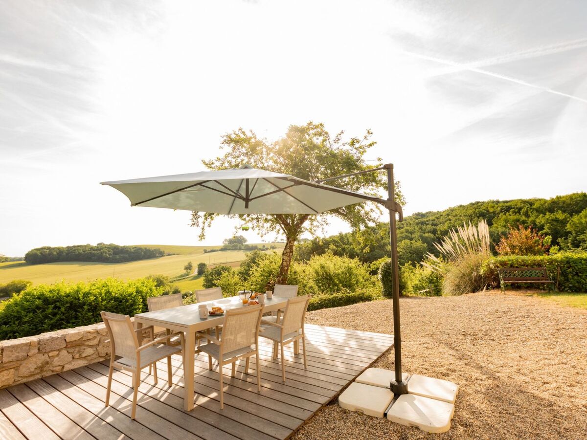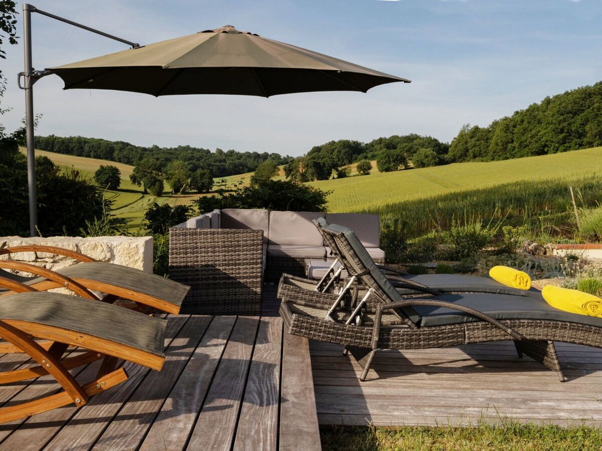Une vue sans nuisance, ni vis à vis et un calme absolu pour profiter des différentes terrasses avec mobilier de jardin et parasols : une terrasse avec vue sur le soleil levant prés de la cuisine pour le petit déjeuner (un régal!), une terrasse solarium avec bains de soleils et coussins, chiliennes, salons de jardin en résine avec coussins, parasols...