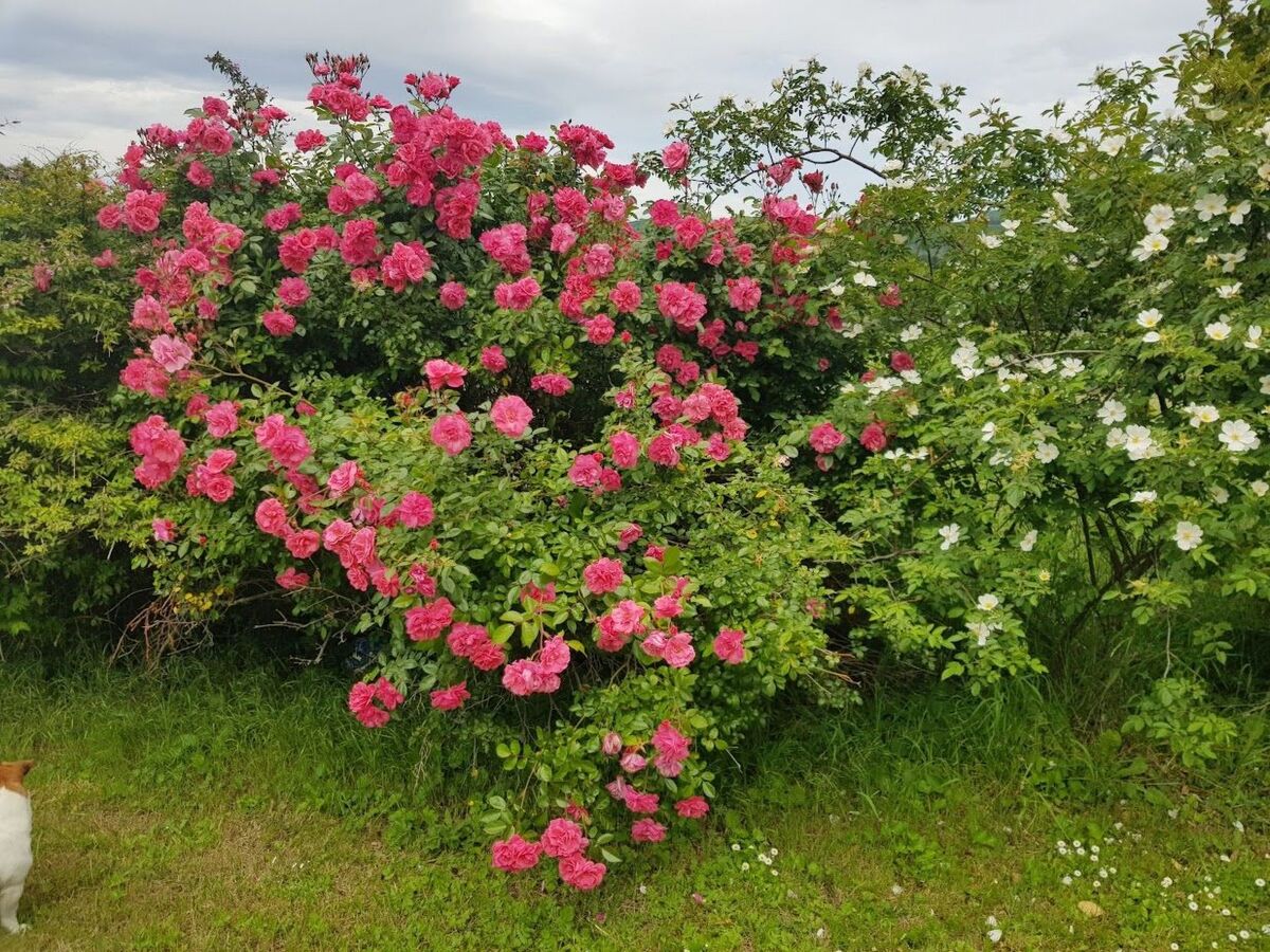 Place de parking ombragé et jardin au milieu de 6 hectares de prairies entouré par les montagnes.
