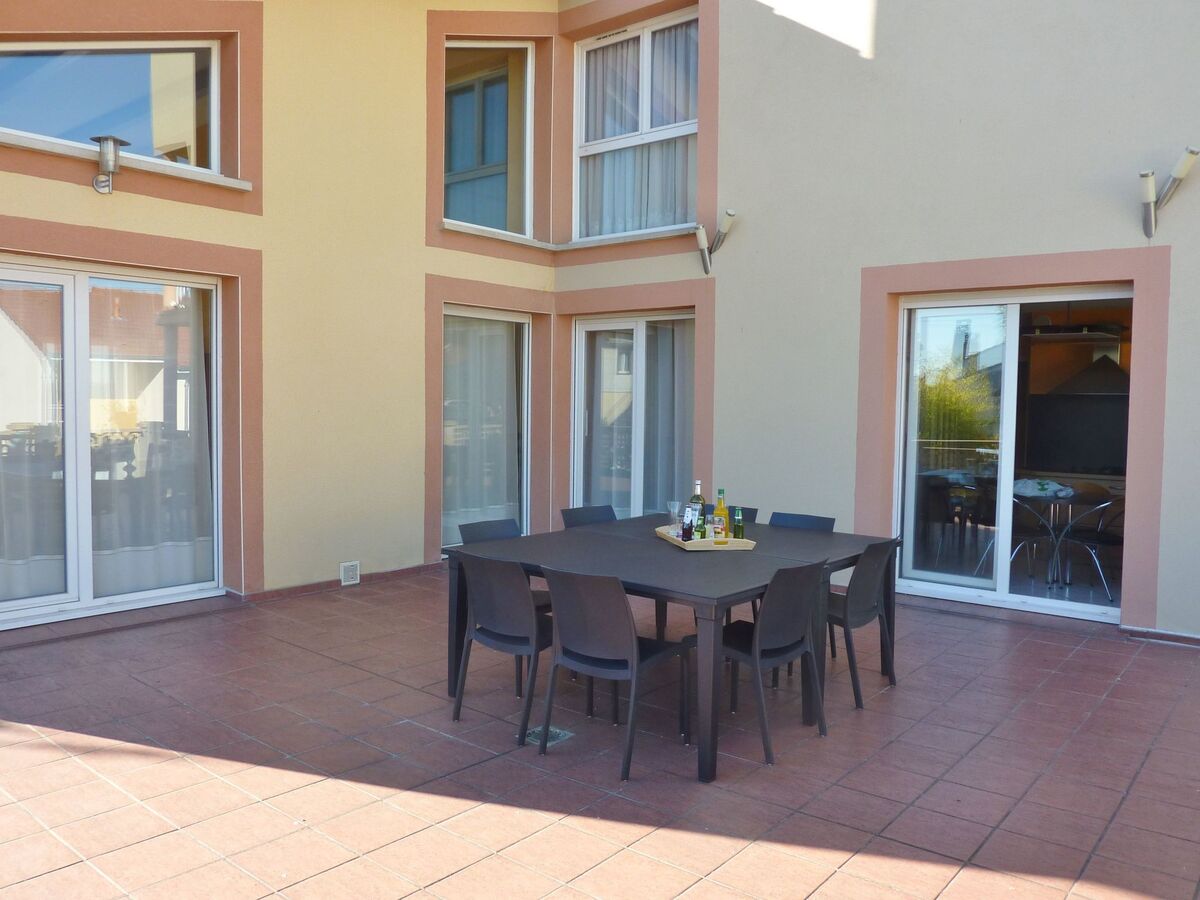 La grande terrasse ensoleillée dispose d'un salon de jardin, et un barbecue se situe à proximité.