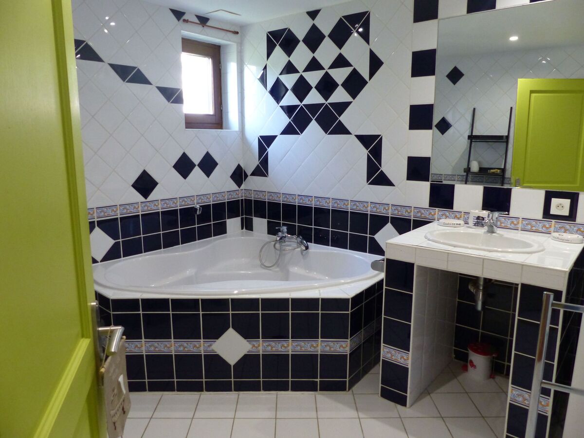 À côté de la cuisine, une salle de bains avec baignoire d'angle, lavabo, WC et lave linge .