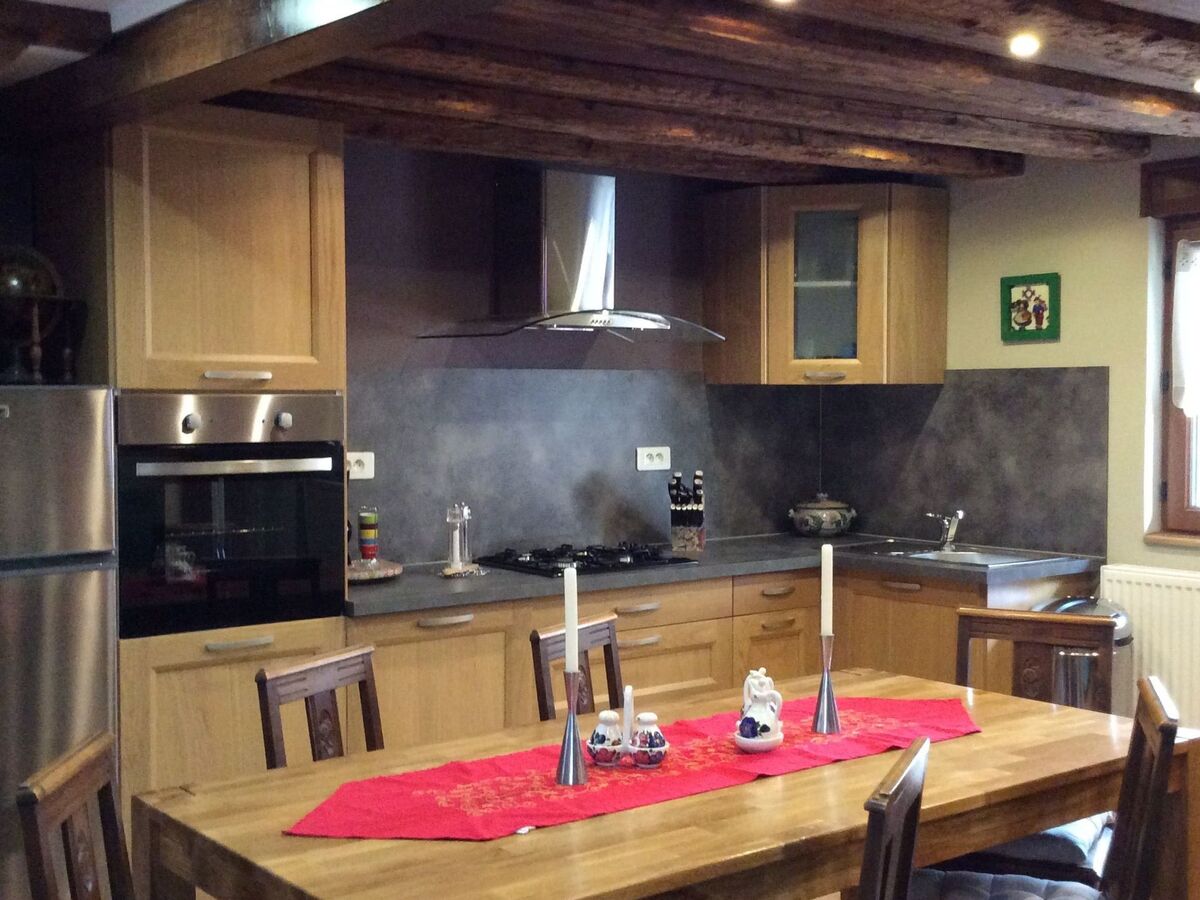 Au premier étage, la cuisine entièrement équipée s'ouvre sur un salon accueillant et une petite chambre avec deux lits individuels.