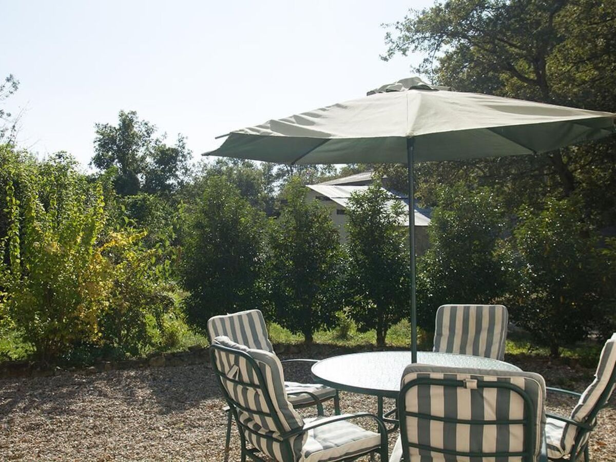 This holiday house is somewhat set apart from the main house, concealed behind trees, with a terrace shielded by a dense hedge.