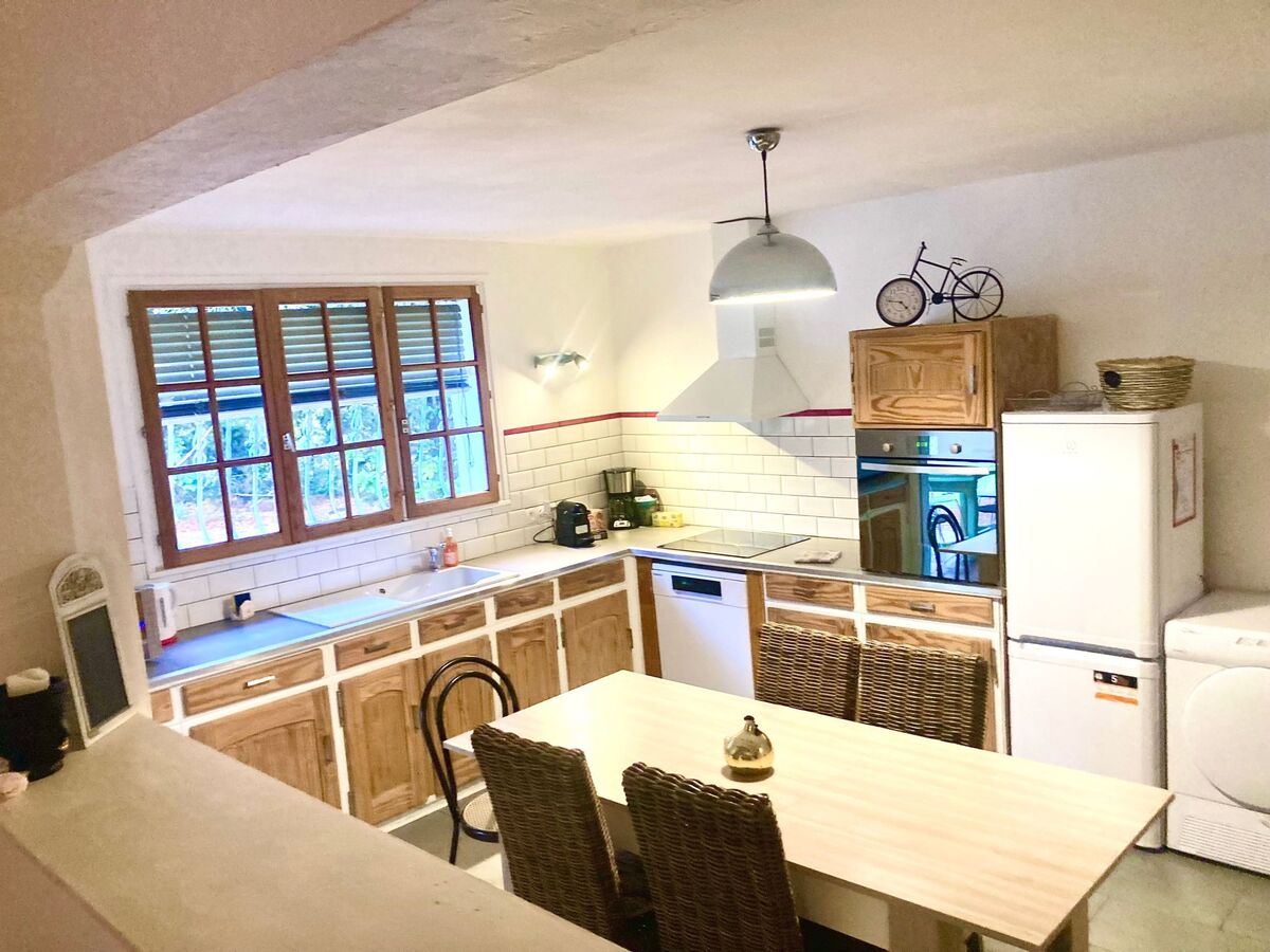La cuisine, coeur de la maison, est entièrement équipée avec une plaque à induction, deux types de cafetières, un lave-vaisselle, et une bouilloire électrique, promettant des moments de convivialité et de partage autour de repas faits maison.