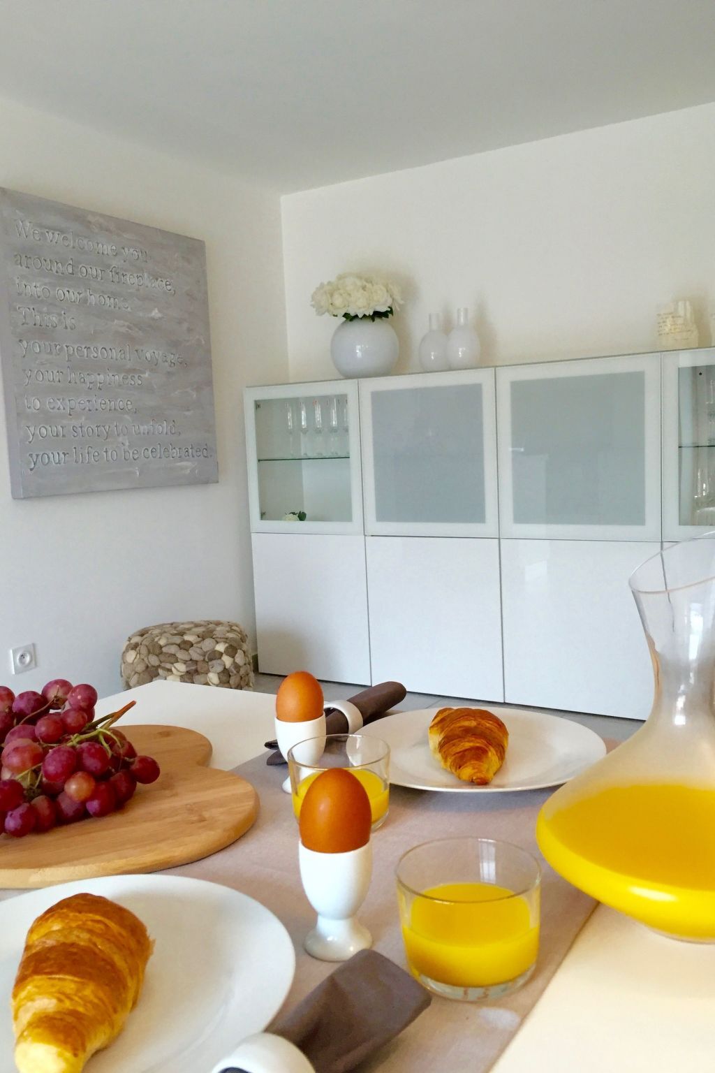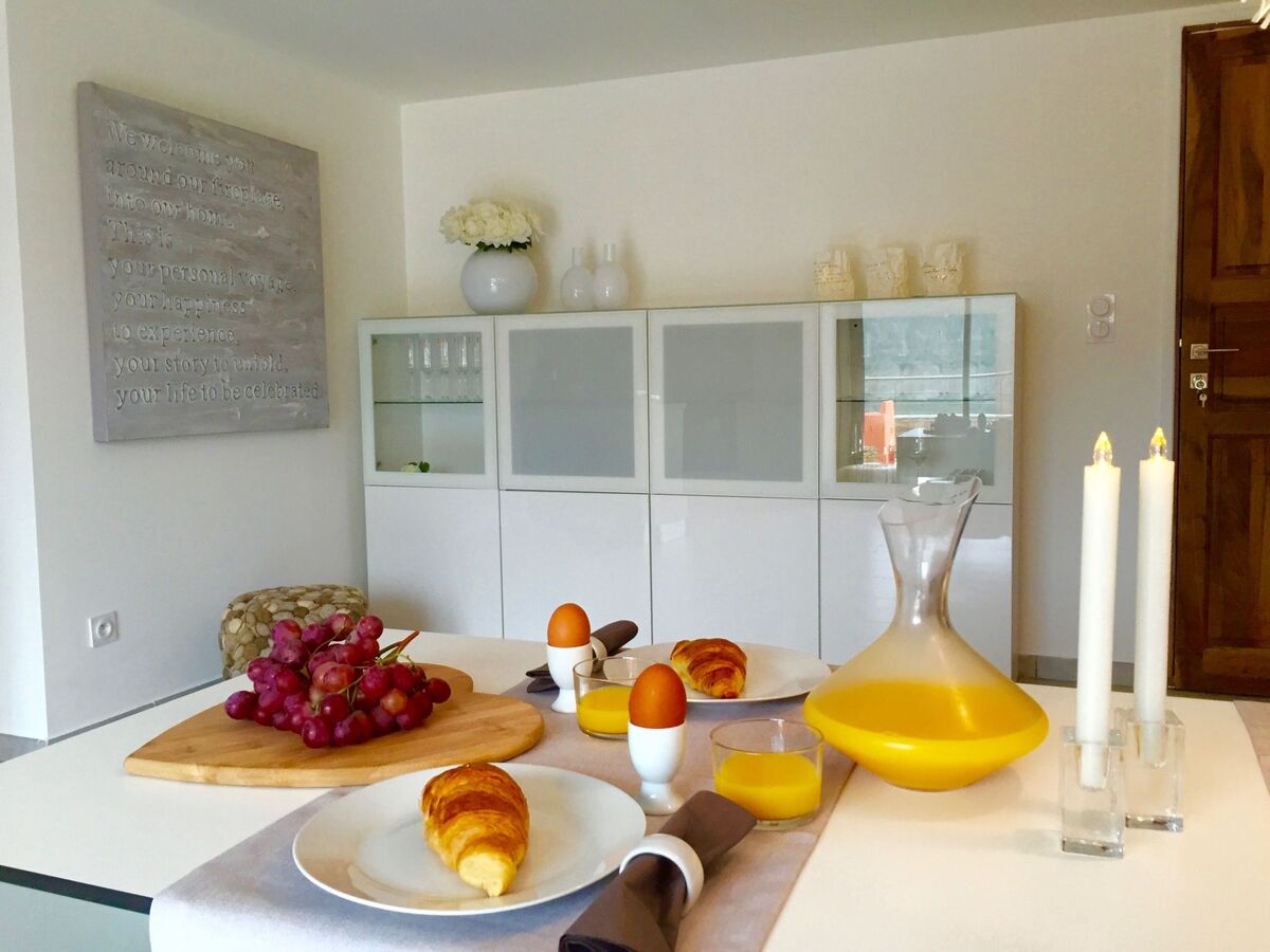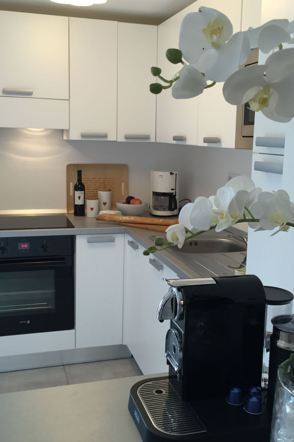 Cuisine moderne equipée avec réfrigérateur/congelateur, plaque de cuisson, four, micro-ondes, lave-vaisselle, machine á cafe nespresso, shaker, grille-pain, bouilloire electrique, vaisselle et utensiles de cuisine.