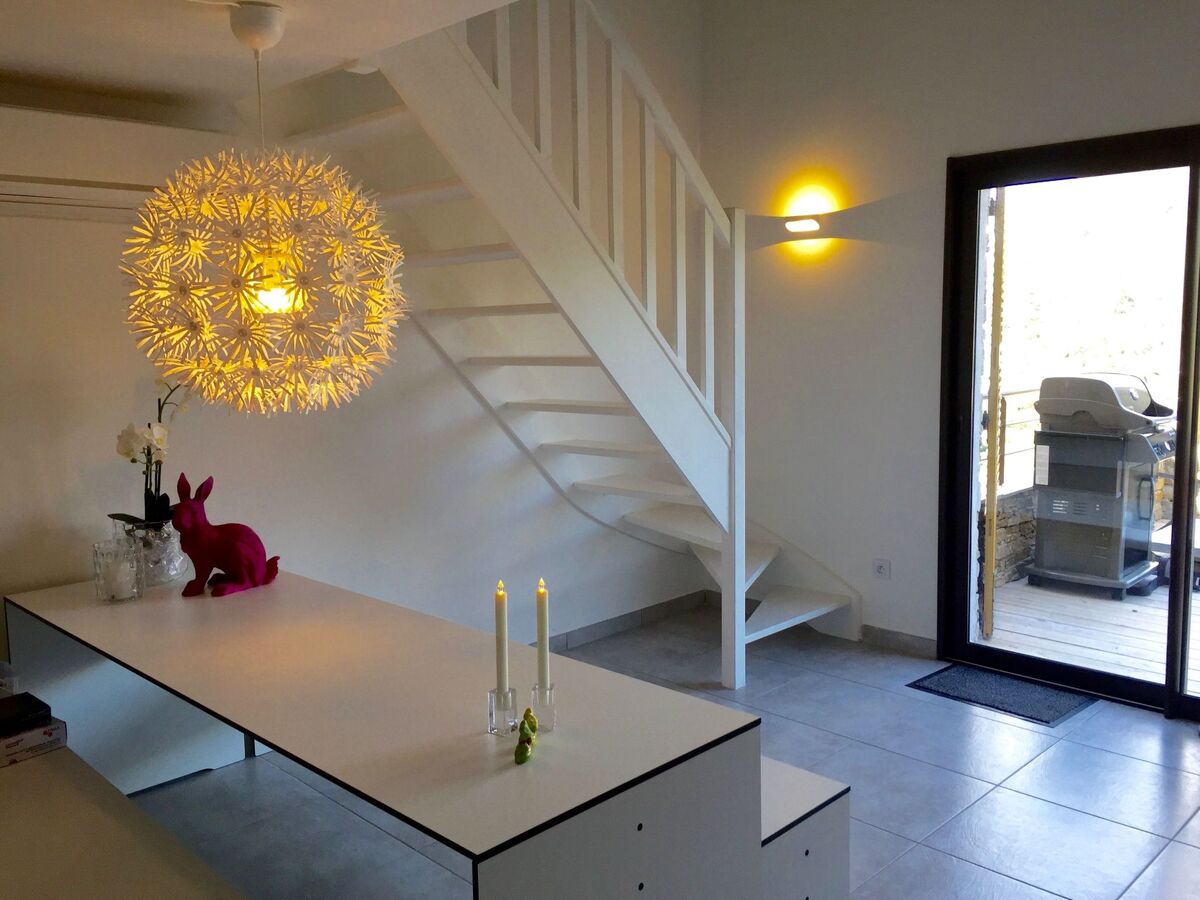 Rez-de-chaussee : grand séjour moderne ouvert sur une cuisine entièrement equipée.