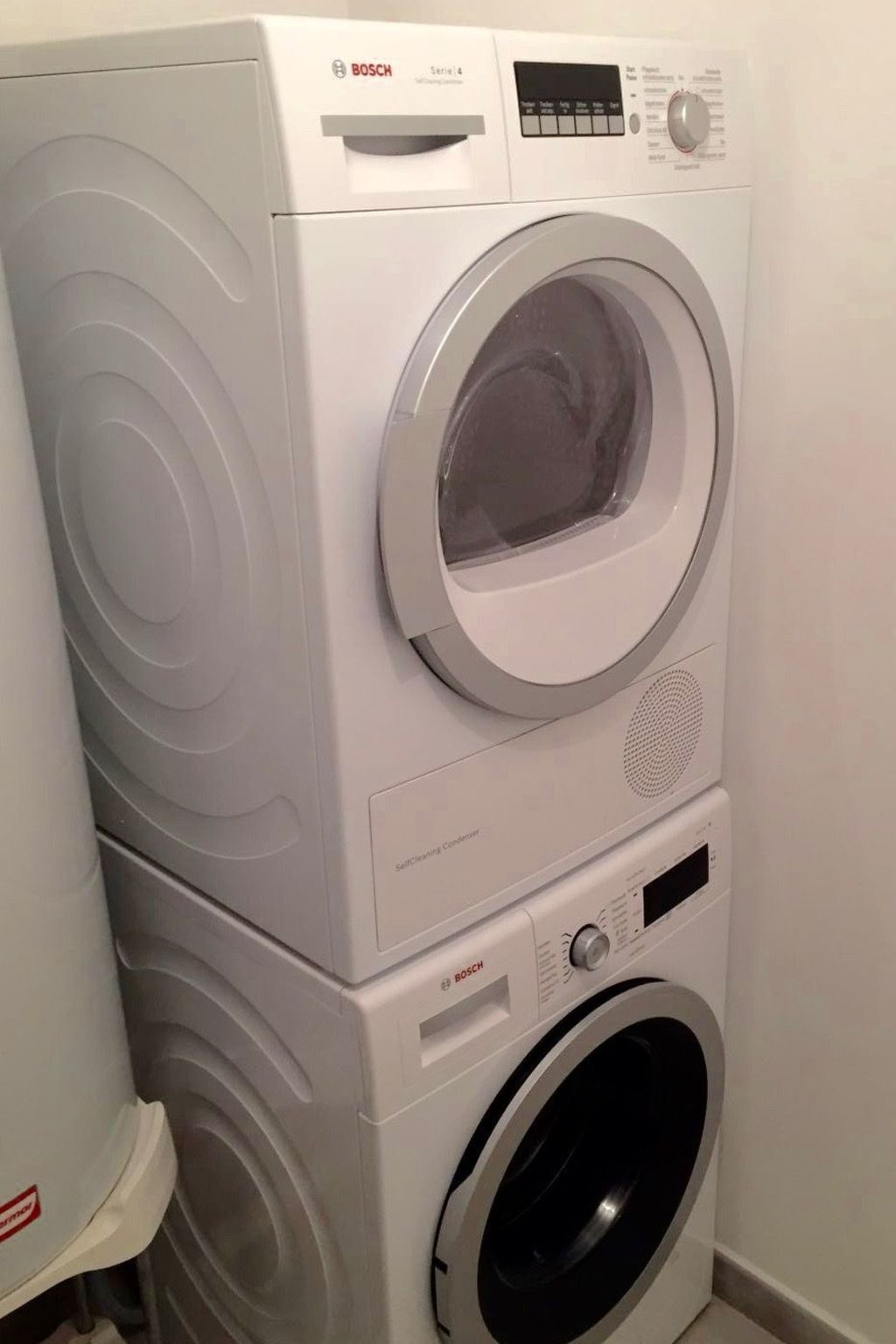 Lave-linge, sèche-linge, fer et planche à repasser, séchoir dans une buanderie.