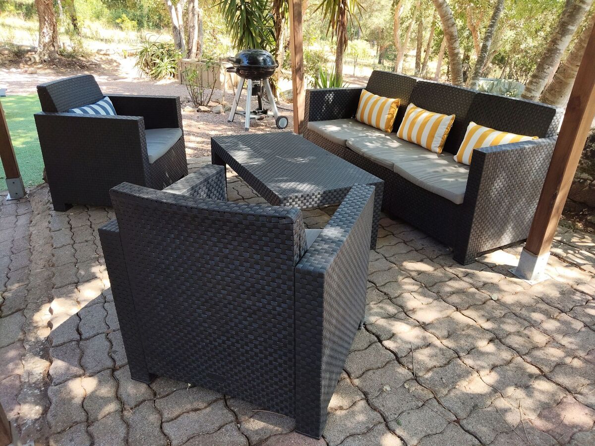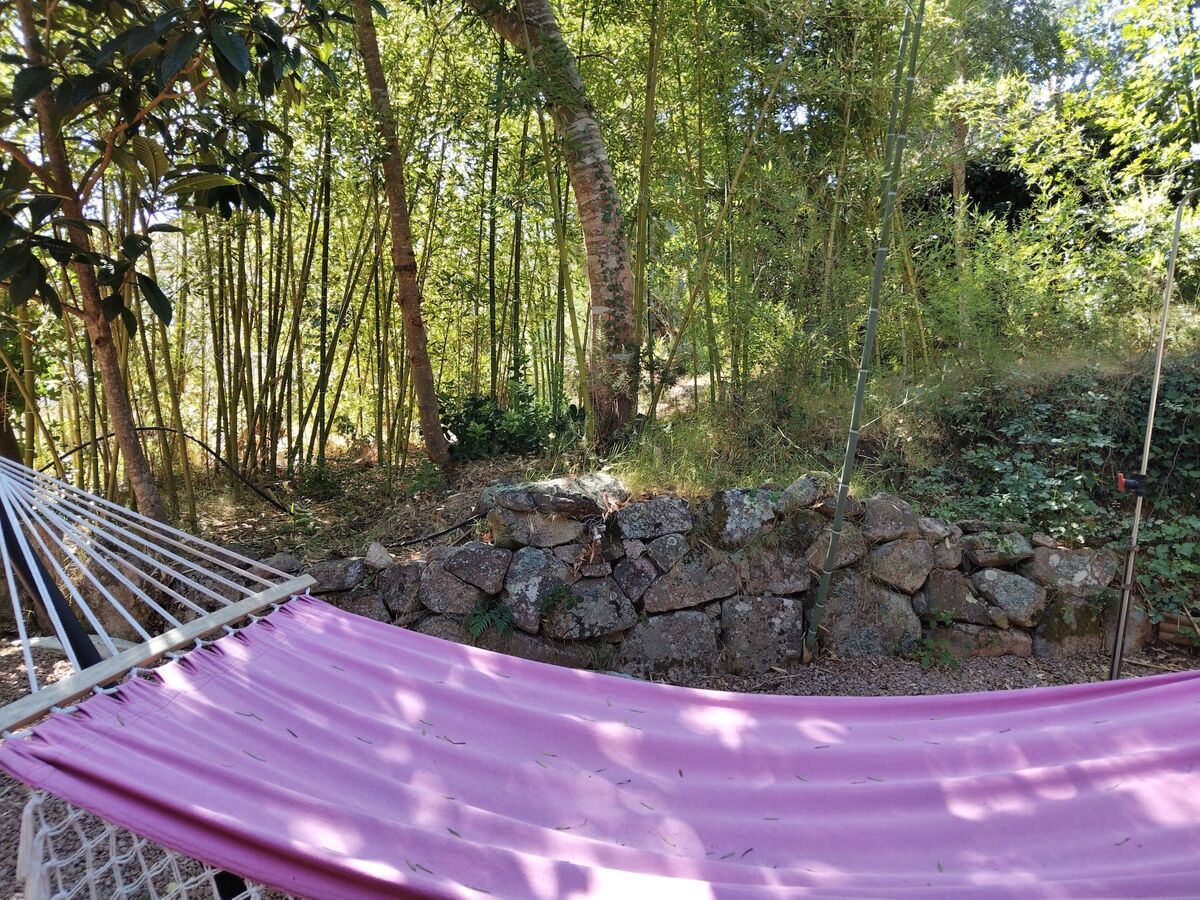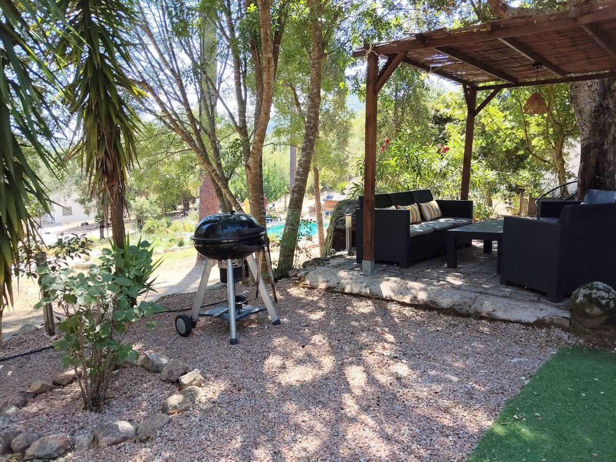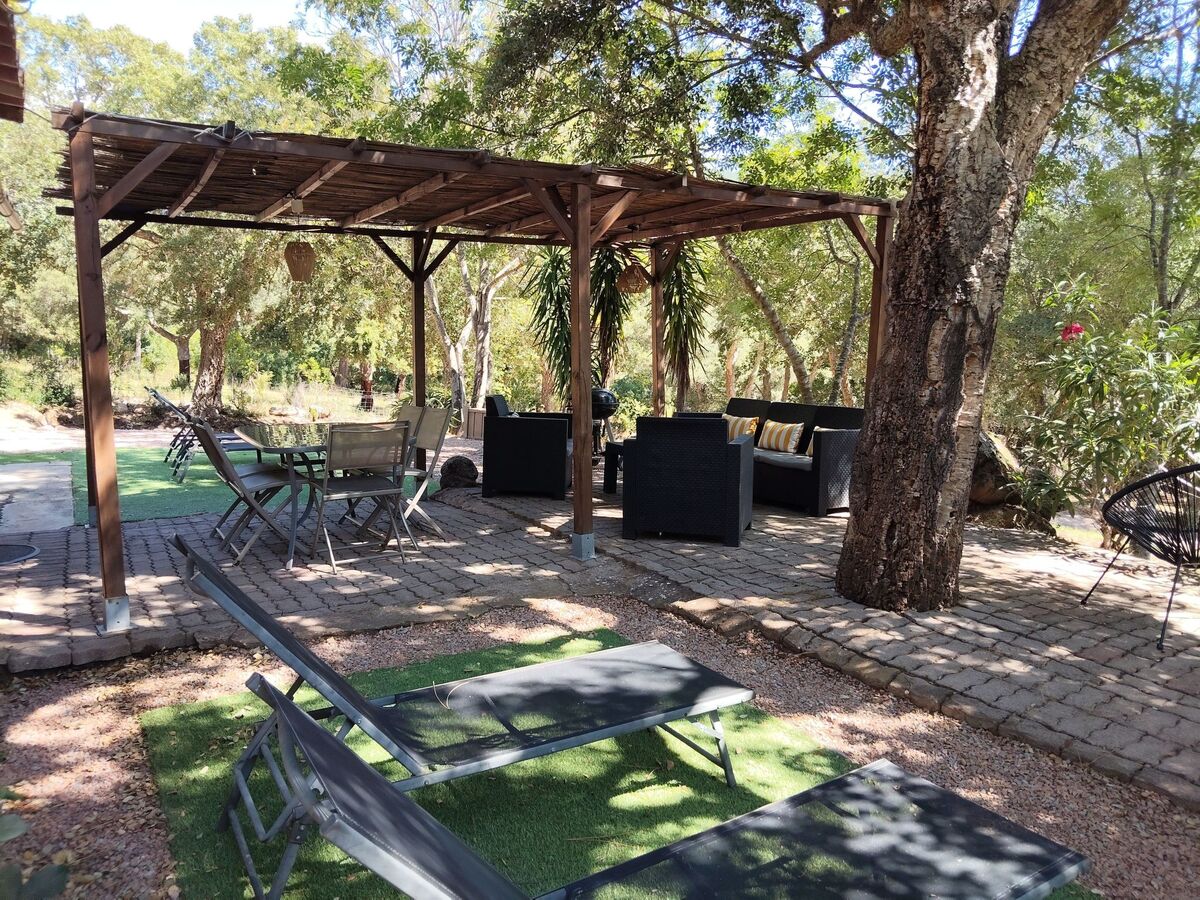 Terrasse avec tables, chaises, transats,barbecue, hamac.