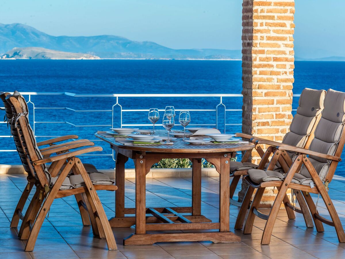 Karavi Villa (Seafront Panorama) stands out for its panoramic 270° views over the Ionian Sea and neighboring islands, evoking the feeling of relaxing on a ship’s deck.