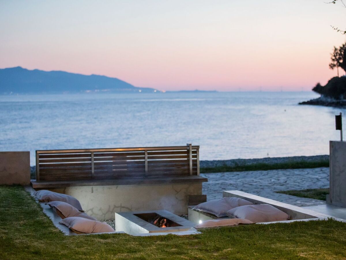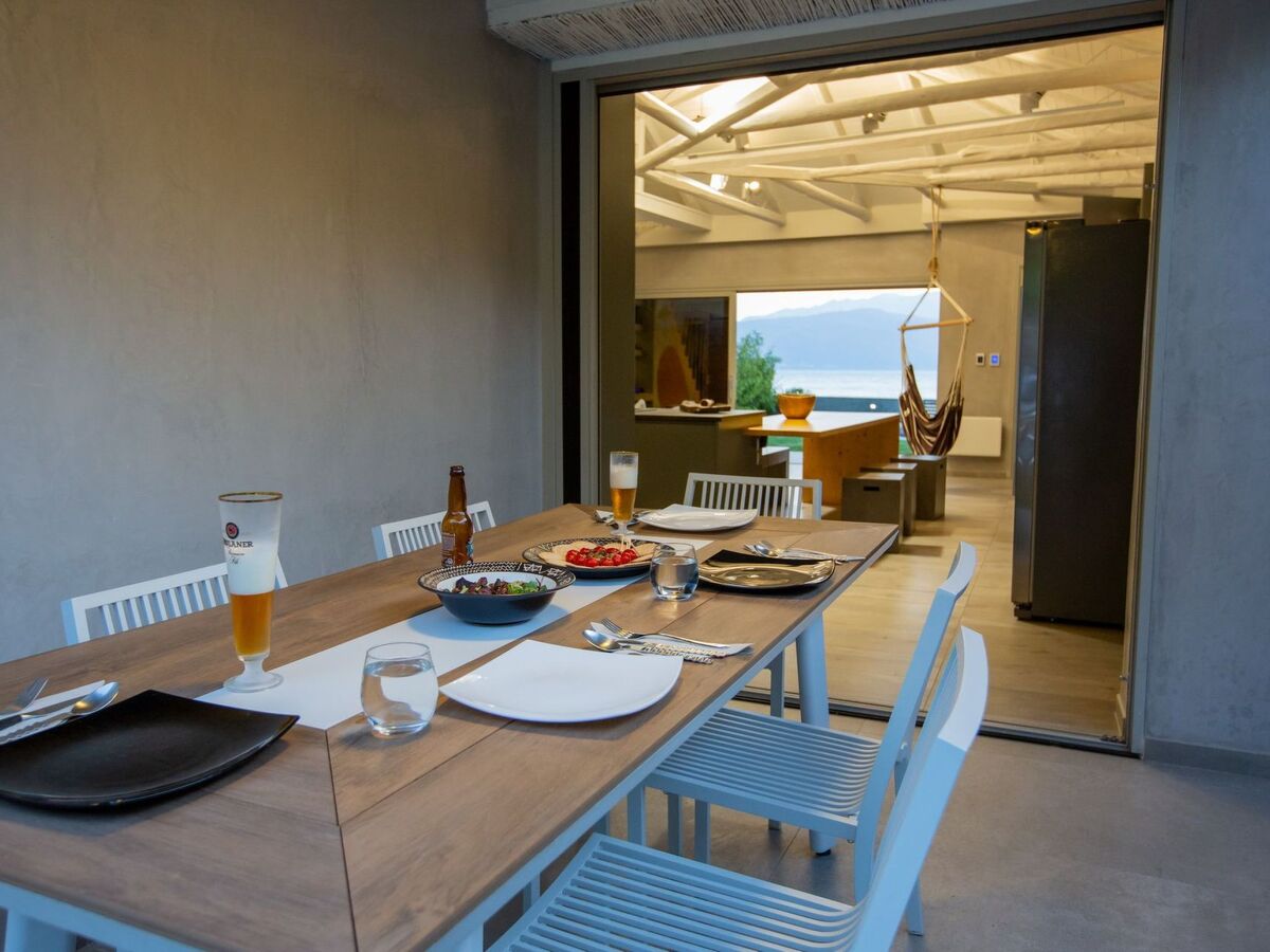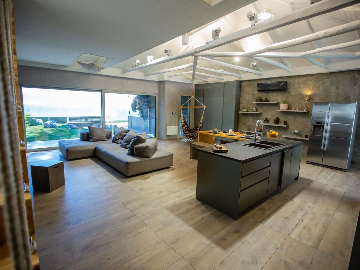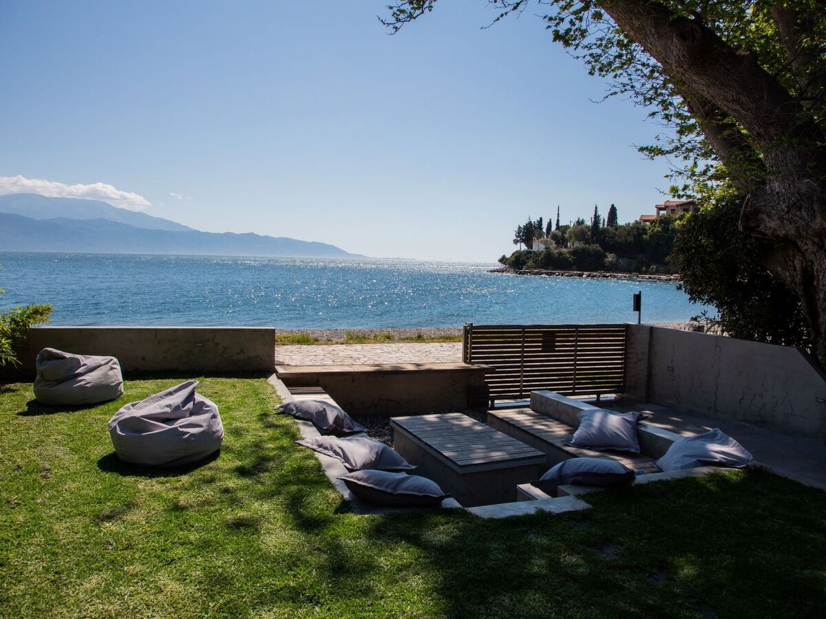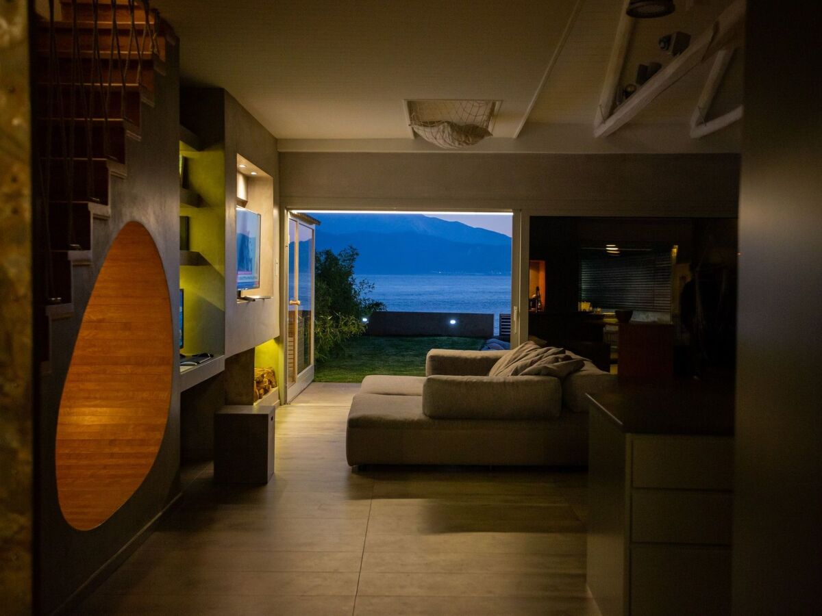 The combination of tall wooden ceilings and large glass doors allows a stunning view on the sea, the Rio-Antirio bridge, a small picturesque church and the Peloponnesian mountains.“ This villa is an absolute smart home, renovated with today’s highest standards of house construction and accomplishes the in-out living perfectly.On the ground floor there is a beautiful living room with a fireplace and a 55” television, an open spaced kitchen with an island fully equipped with branded built-in electrical devices, a dedicated multimedia workspace, and a built-in “nock” couch all in the same open space.There is also a large master bedroom with a king size bed, a double doored closet, a bathroom with two sinks and an in-out shower with multiple water ejectors.