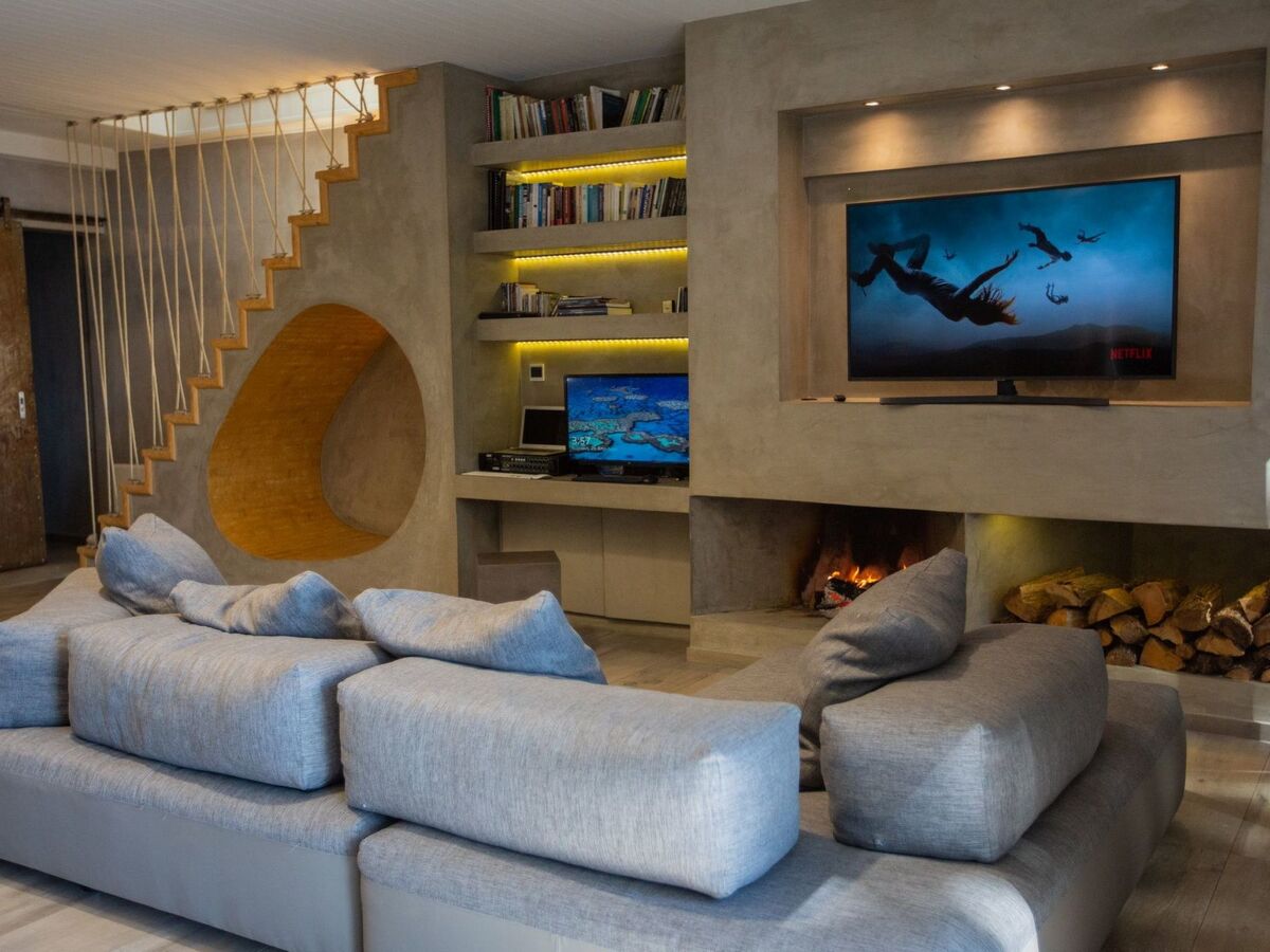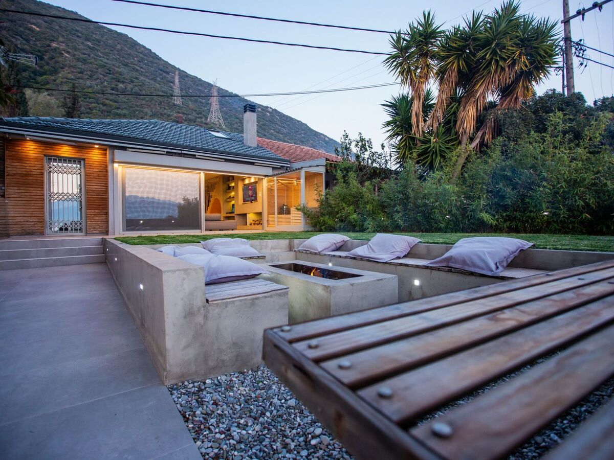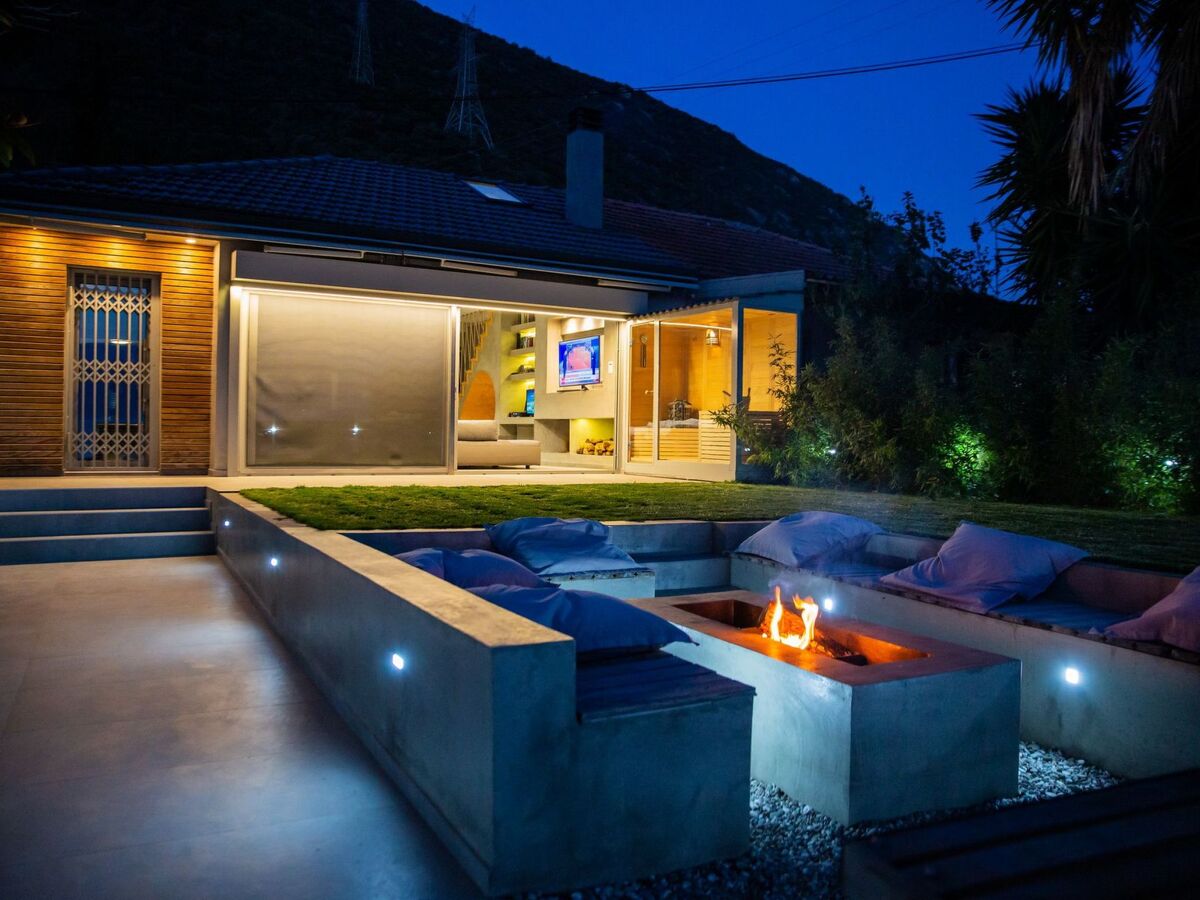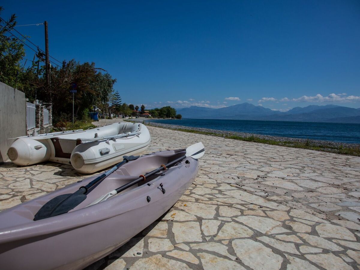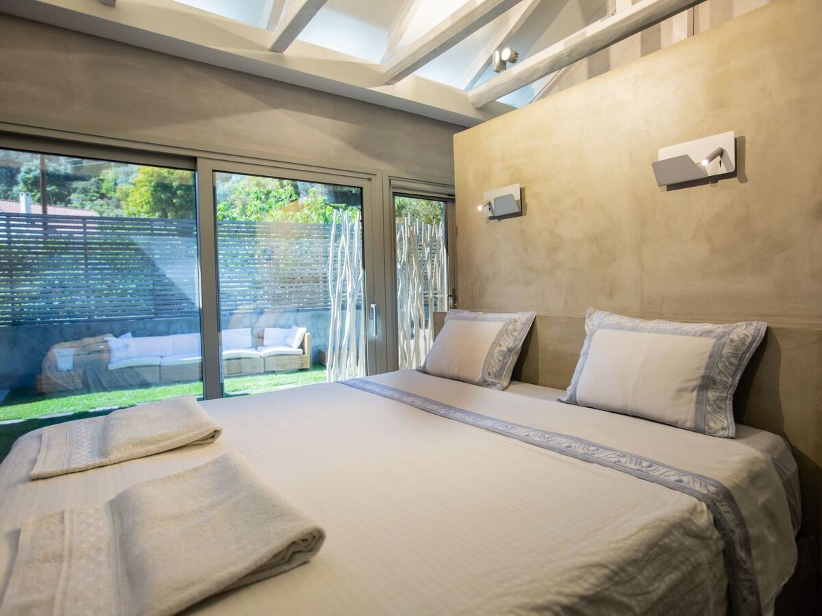 The combination of tall wooden ceilings and large glass doors allows a stunning view on the sea, the Rio-Antirio bridge, a small picturesque church and the Peloponnesian mountains.“ This villa is an absolute smart home, renovated with today’s highest standards of house construction and accomplishes the in-out living perfectly.On the ground floor there is a beautiful living room with a fireplace and a 55” television, an open spaced kitchen with an island fully equipped with branded built-in electrical devices, a dedicated multimedia workspace, and a built-in “nock” couch all in the same open space.There is also a large master bedroom with a king size bed, a double doored closet, a bathroom with two sinks and an in-out shower with multiple water ejectors.