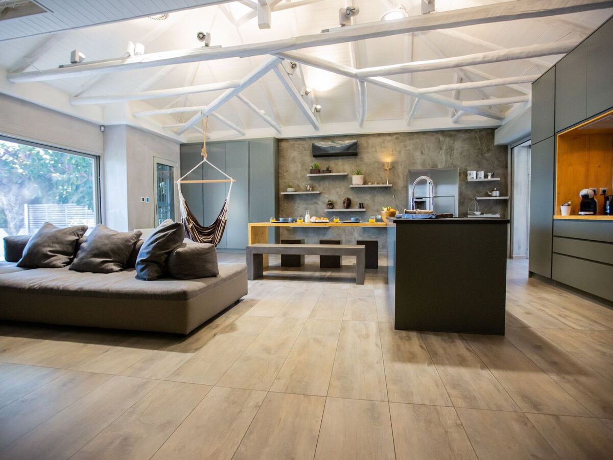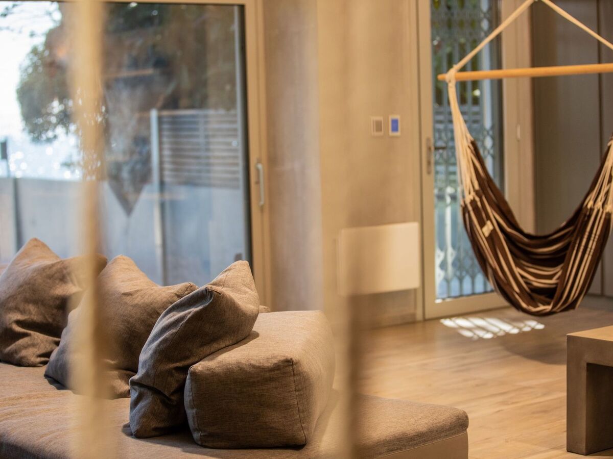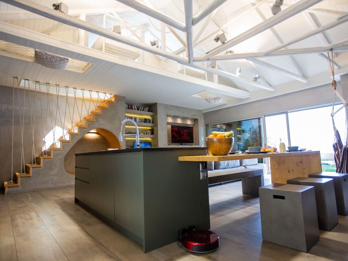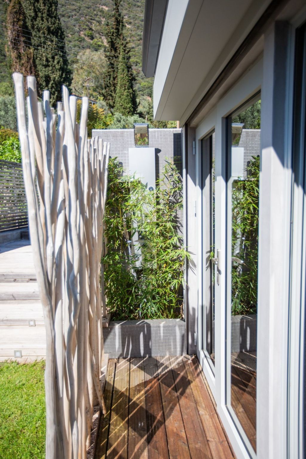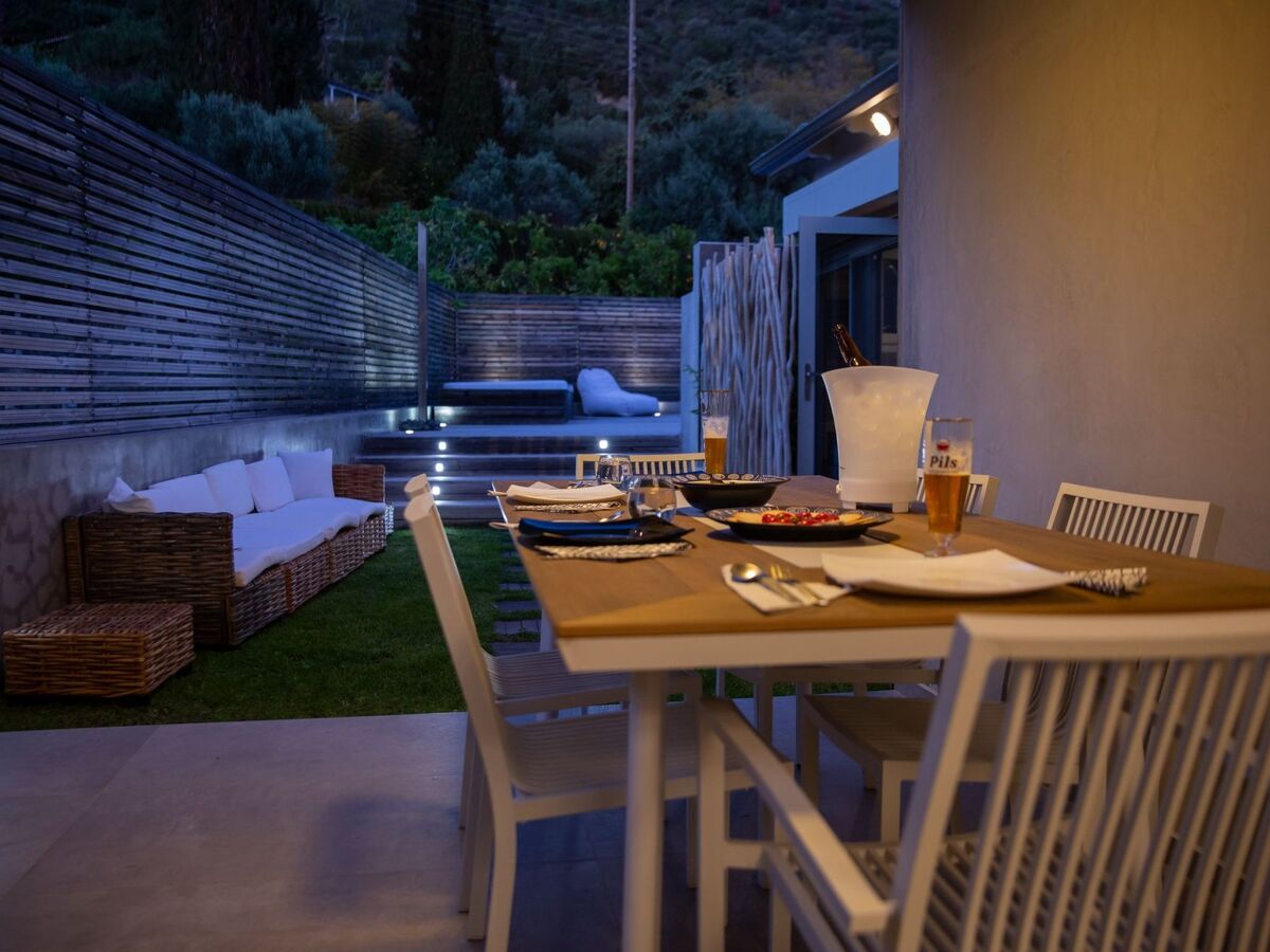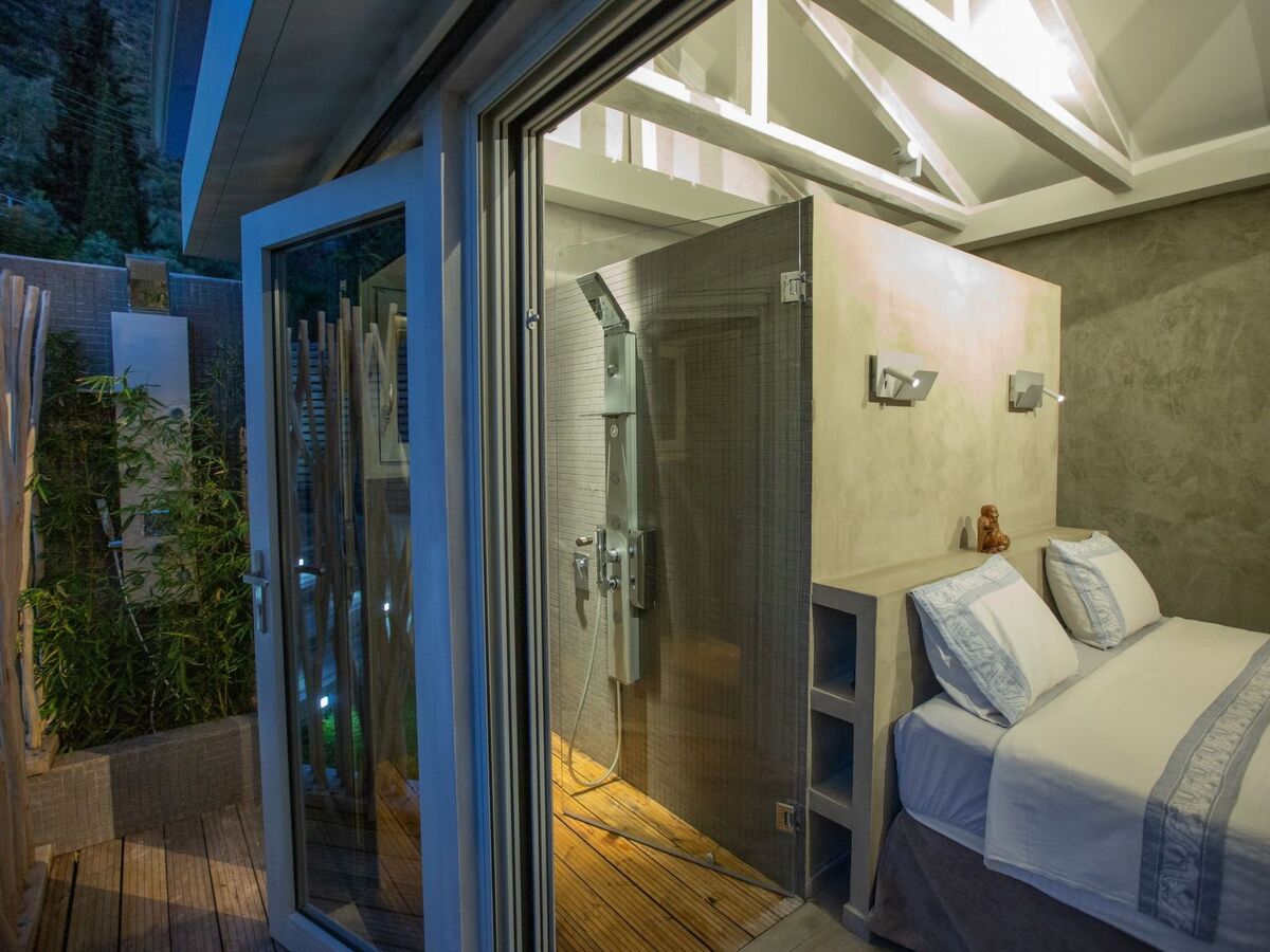 The combination of tall wooden ceilings and large glass doors allows a stunning view on the sea, the Rio-Antirio bridge, a small picturesque church and the Peloponnesian mountains.“ This villa is an absolute smart home, renovated with today’s highest standards of house construction and accomplishes the in-out living perfectly.On the ground floor there is a beautiful living room with a fireplace and a 55” television, an open spaced kitchen with an island fully equipped with branded built-in electrical devices, a dedicated multimedia workspace, and a built-in “nock” couch all in the same open space.There is also a large master bedroom with a king size bed, a double doored closet, a bathroom with two sinks and an in-out shower with multiple water ejectors.