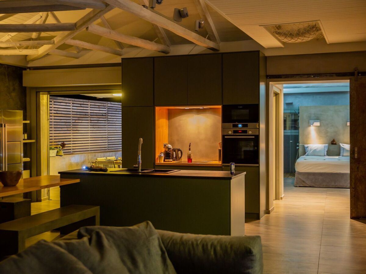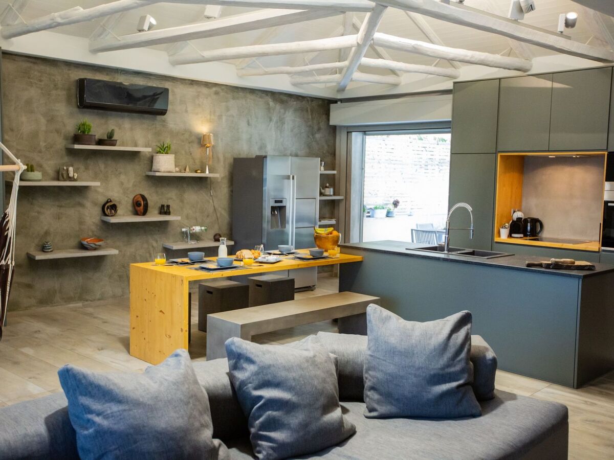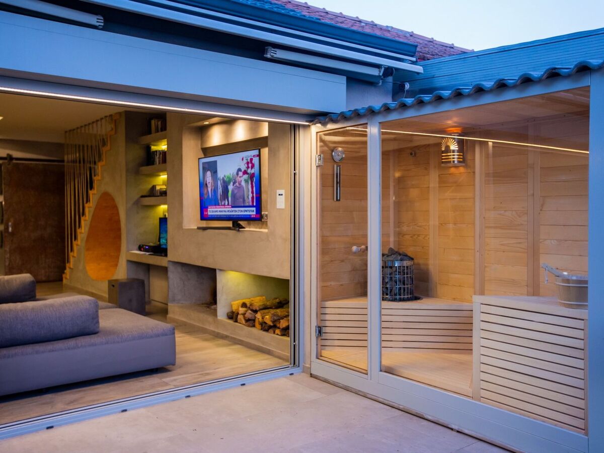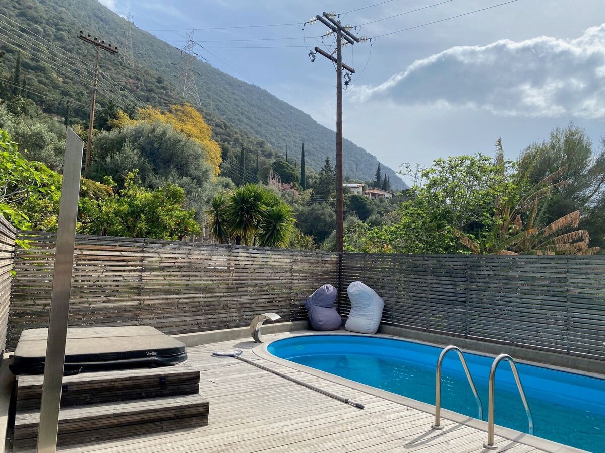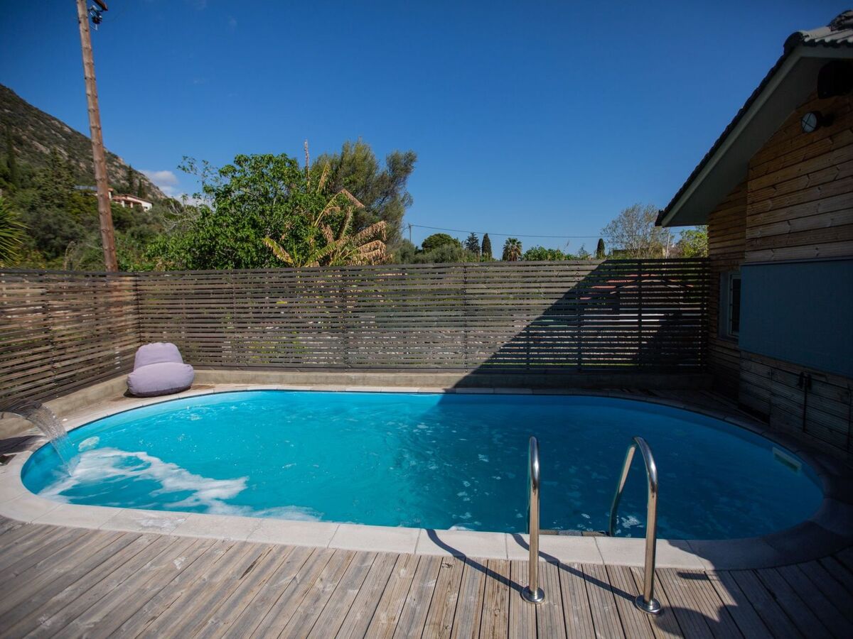 The combination of tall wooden ceilings and large glass doors allows a stunning view on the sea, the Rio-Antirio bridge, a small picturesque church and the Peloponnesian mountains.“ This villa is an absolute smart home, renovated with today’s highest standards of house construction and accomplishes the in-out living perfectly.On the ground floor there is a beautiful living room with a fireplace and a 55” television, an open spaced kitchen with an island fully equipped with branded built-in electrical devices, a dedicated multimedia workspace, and a built-in “nock” couch all in the same open space.There is also a large master bedroom with a king size bed, a double doored closet, a bathroom with two sinks and an in-out shower with multiple water ejectors.