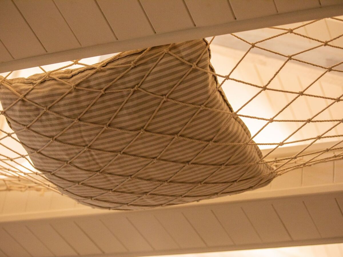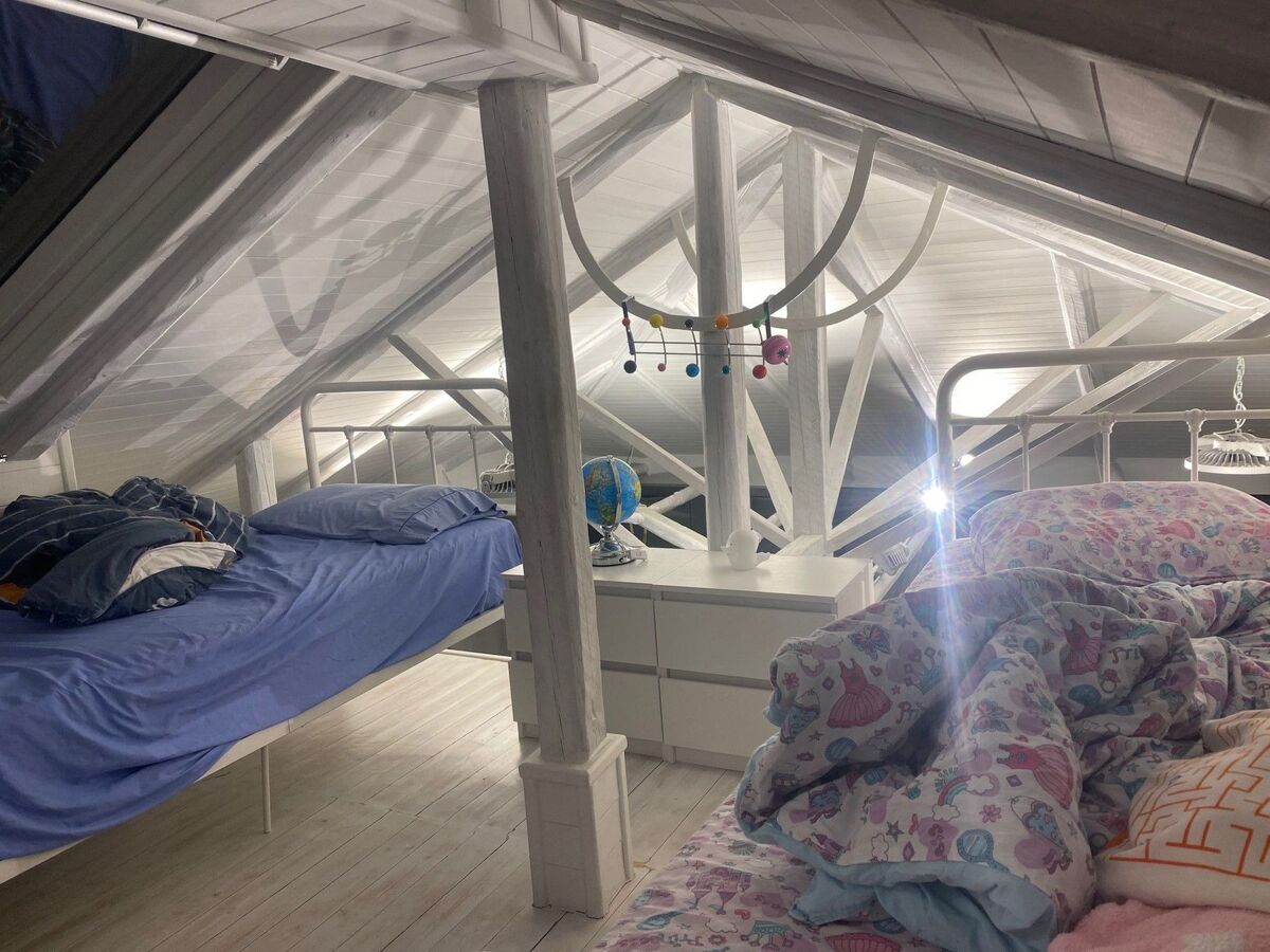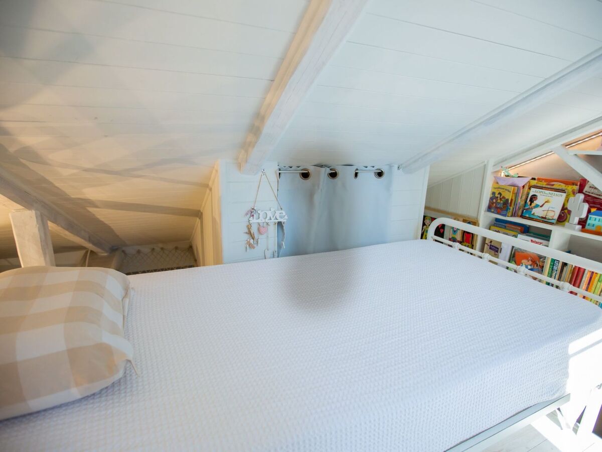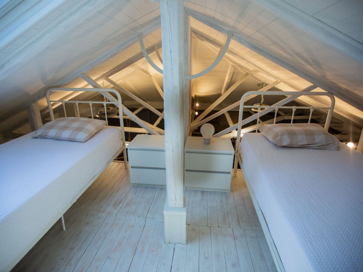 On the second floor (attic) there is a bedroom with 2 single beds, 2 hammock beds, a desk with a bookcase and a roof window that offers a unique view and brightens up the place.
