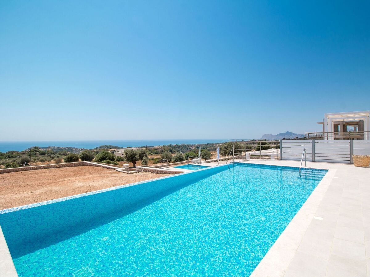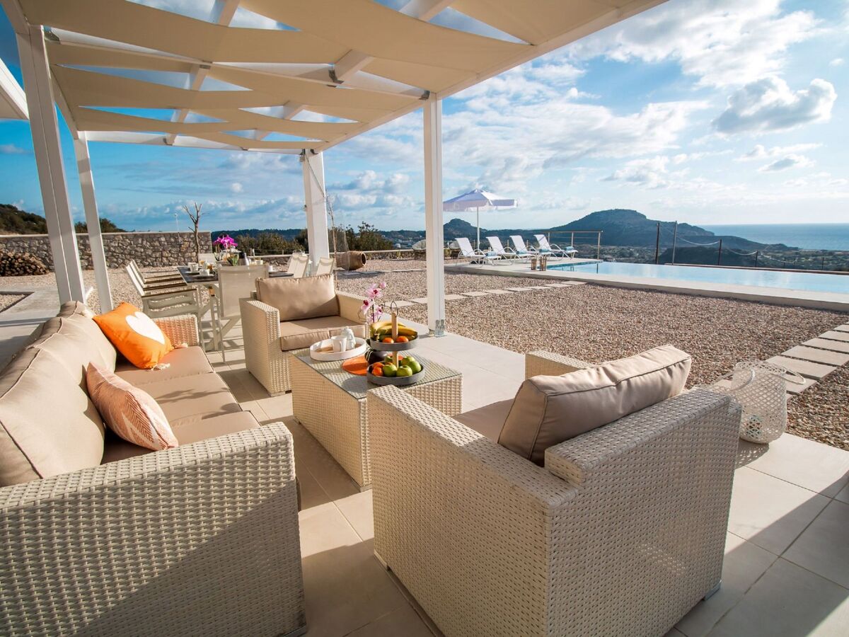 Outdoors, there’s a private swimming pool surrounded by the sunbeds and the mesmerizing sea view and a sitting area.