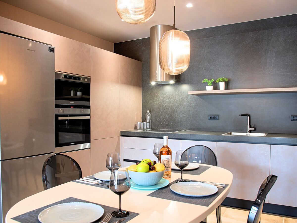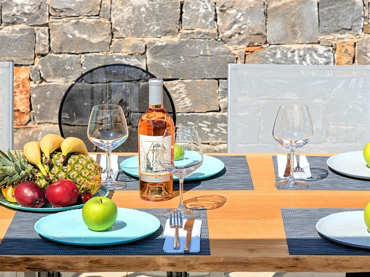 Ground floor● A bedroom with two single pushed together beds and private bathroom.● A bedroom with two single pushed together beds and private bathroom Upper floor● A living room with a large corner sofa (can accommodate two beds) and direct access to the terrace and the pool area.● Smart TV at the living room● Large Kitchen / dining area with an oven, a fridge, a coffee maker, tea facilities, a juicer, a toaster and a dish set.● A bedroom with a queen-size double bed.