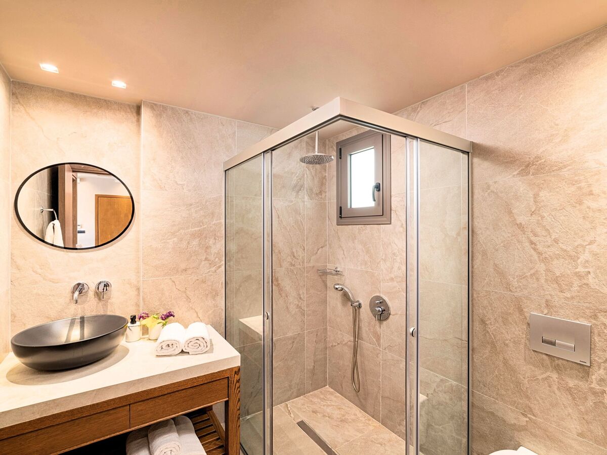 Alpha Sissi Lux VillaFacilitiesGround floor● A bedroom with two single pushed together beds and private bathroom.● A bedroom with two single pushed together beds and private bathroom Upper floor● A living room with a large corner sofa (can accommodate two beds) and direct access to the terrace and the pool area.● Smart TV at the living room● Large Kitchen / dining area with an oven, a fridge, a coffee maker, tea facilities, a juicer, a toaster and a dish set.● A bedroom with a queen-size double bed.
