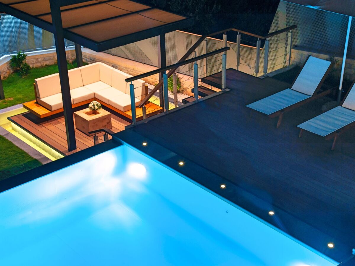 Outdoors, a spacious terrace with BBQ and dining area overlooks the Jacuzzi, the private pool and the relaxing sun beds area.