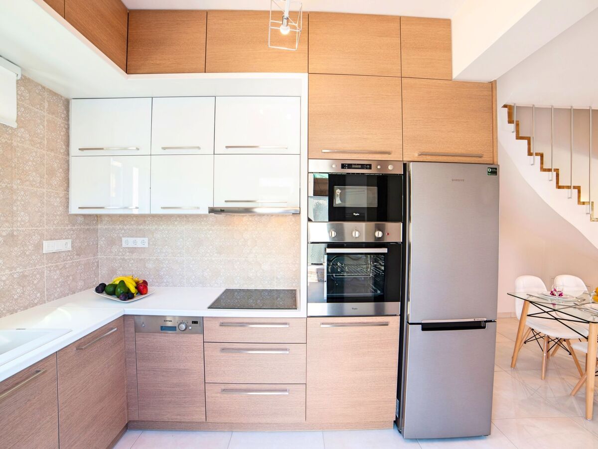 A modern, fully equipped kitchen with dining area lies at the lower level, combined with a luxurious bathroom and an adjoining living room area with corner sofa and all that with direct access to the pool.
