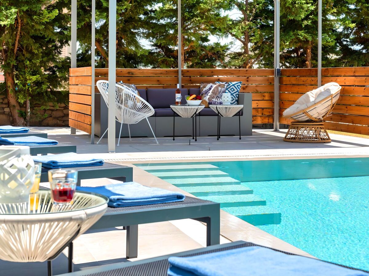 The sun terrace, adorned with comfortable sun loungers and umbrellas, invites you to bask in the warm Mediterranean sun.