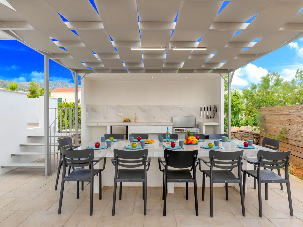 The villa features a spacious living area, a fully equipped kitchen, and five cozy bedrooms, each designed to ensure a restful stay.
