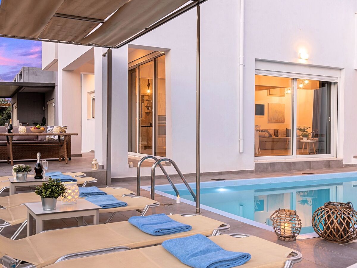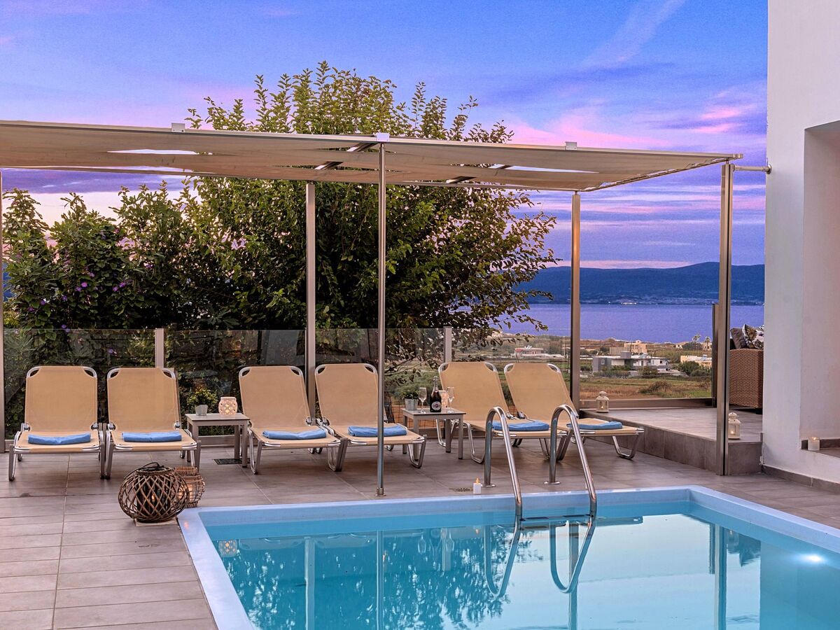 Cretan Sunset Villa is the ideal base for discovering all the elements that make Crete a top destination.With scenic views to the Cretan Sea and the White Mountains.It is just a few minutes' walk from the most famous long sandy beach of Georgioupolis-Episkopi with the crystal-clear waters and Kournas lake.The experience of staying at Cretan Sunset Villa consists of a special game that captures the senses.Here you are not to enjoy TV or browsing your laptop but the breathless sea view over the scenic landscape.The luxury here is not in technology and the fancy materials, but the reactivation of the senses that have been diminished by the modern rhythms of life.Here, the meaning lies in the singing of the birds and the heady aromas of the herbs that grow in every corner of the island.Facilities & ServicesCretan Sunset Villa is the ideal choice for those who seek moments of absolute relaxation and tranquility.Start your day enjoying a rich breakfast made with the finest Cretan ingredients before heading out to some of the beaches of the island.In the afternoons, relax next to the swimming pool, enjoying your drink or a snack and gazing at the endless blue of the Aegean.We firmly believe that the greatest satisfaction lies in the simplest things.