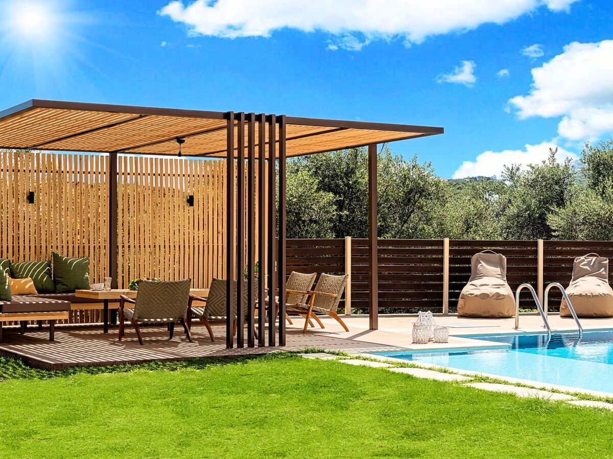 On the outside, the crystal clear private pool is surrounded by a lush garden overlooking the nearby lake and the Cretan sea.The pool with children's area is reserved exclusively for the enjoyment of the residents.